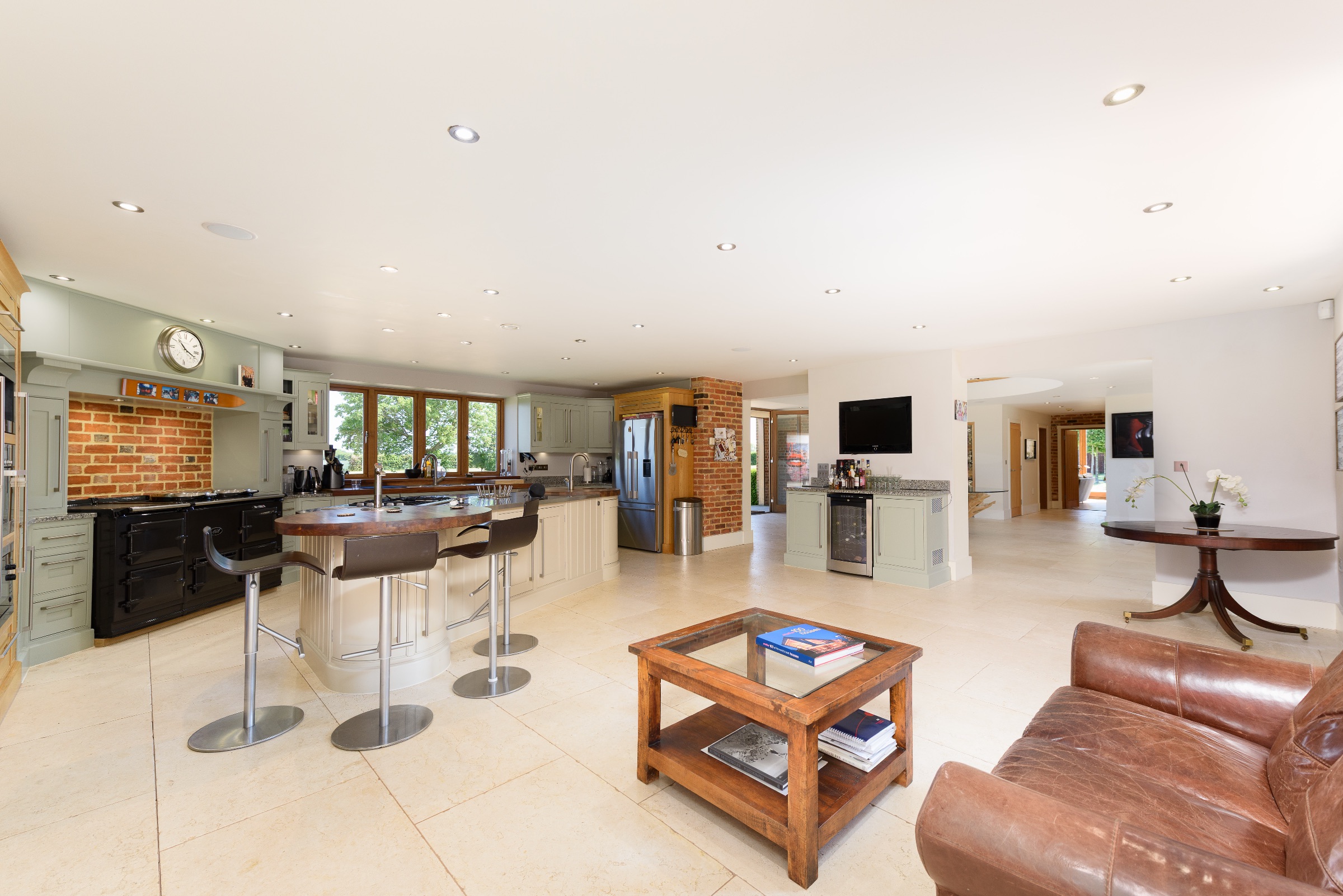 Entering the home through the oversized plate glass doors you are immediately struck by the volumes and light of the reception area and grand wrap around cascade staircase.  The property flows delightfully from this central signature atrium through to a beautiful expansive family kitchen providing over 30ft of open entertaining space and the beating heart of the house. The kitchen itself is appointed with the full range of integrated appliances, including an AGA range, American style fridge, coffee machine and chef's island.