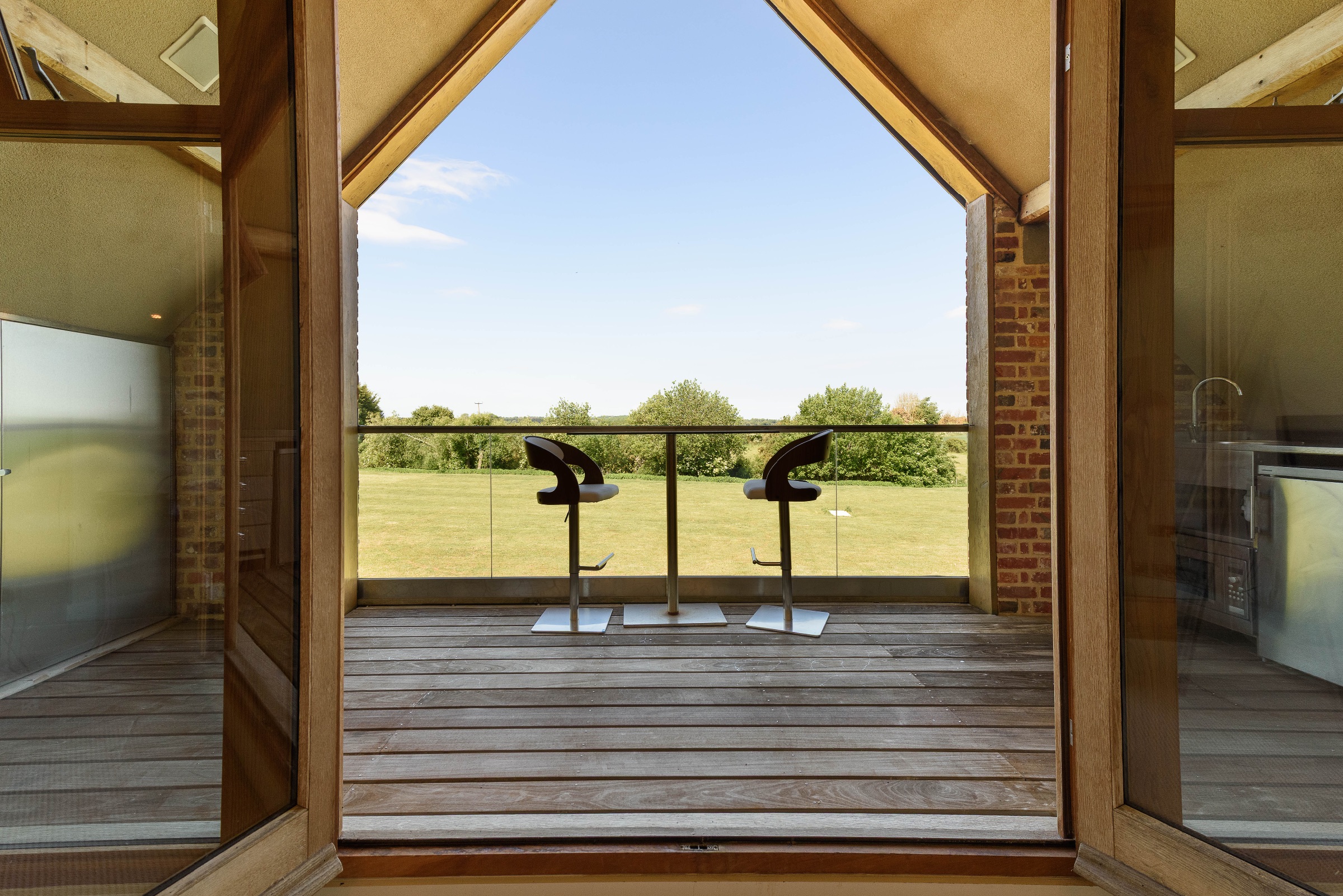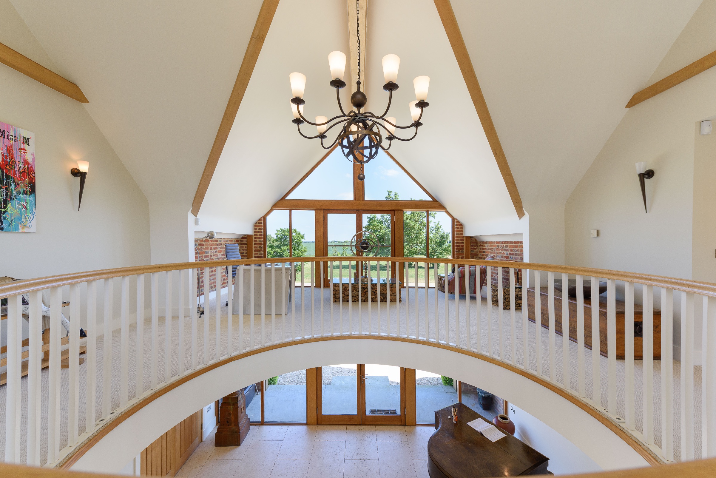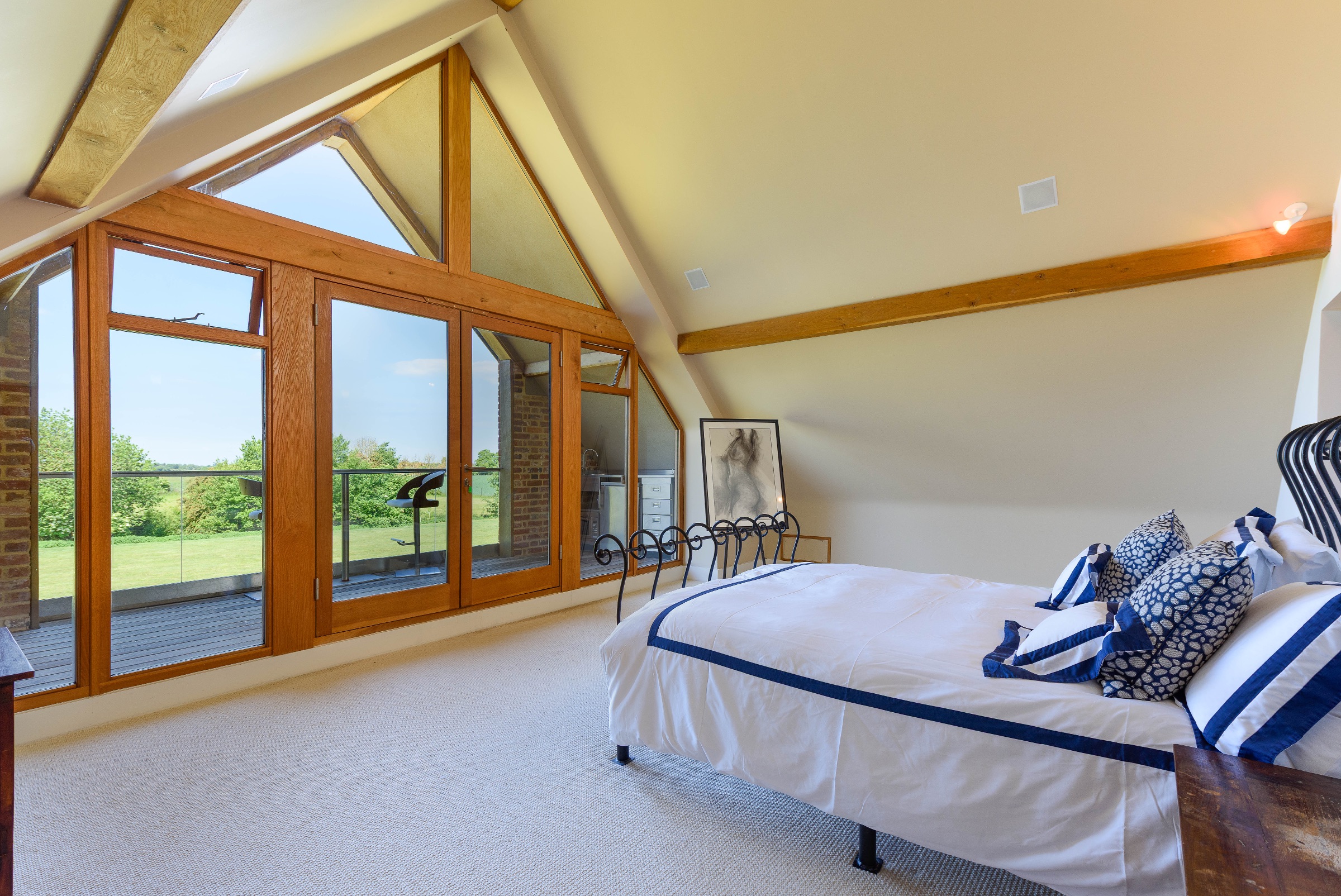 Continuing up to the sumptuous first floor the home now provides five luxurious bedroom suites with a wealth of bespoke built-in wardrobe solutions, branching off from the hallways via the main atrium, with its far-reaching framed views and lofty vaulted ceiling. The principal suite has double doors opening to its own private balcony, a fitted dressing room and a modern en suite bathroom. The house also features a guest suite with its own dressing room and French doors and three further bedrooms all serviced by contemporary en suite facilities.
