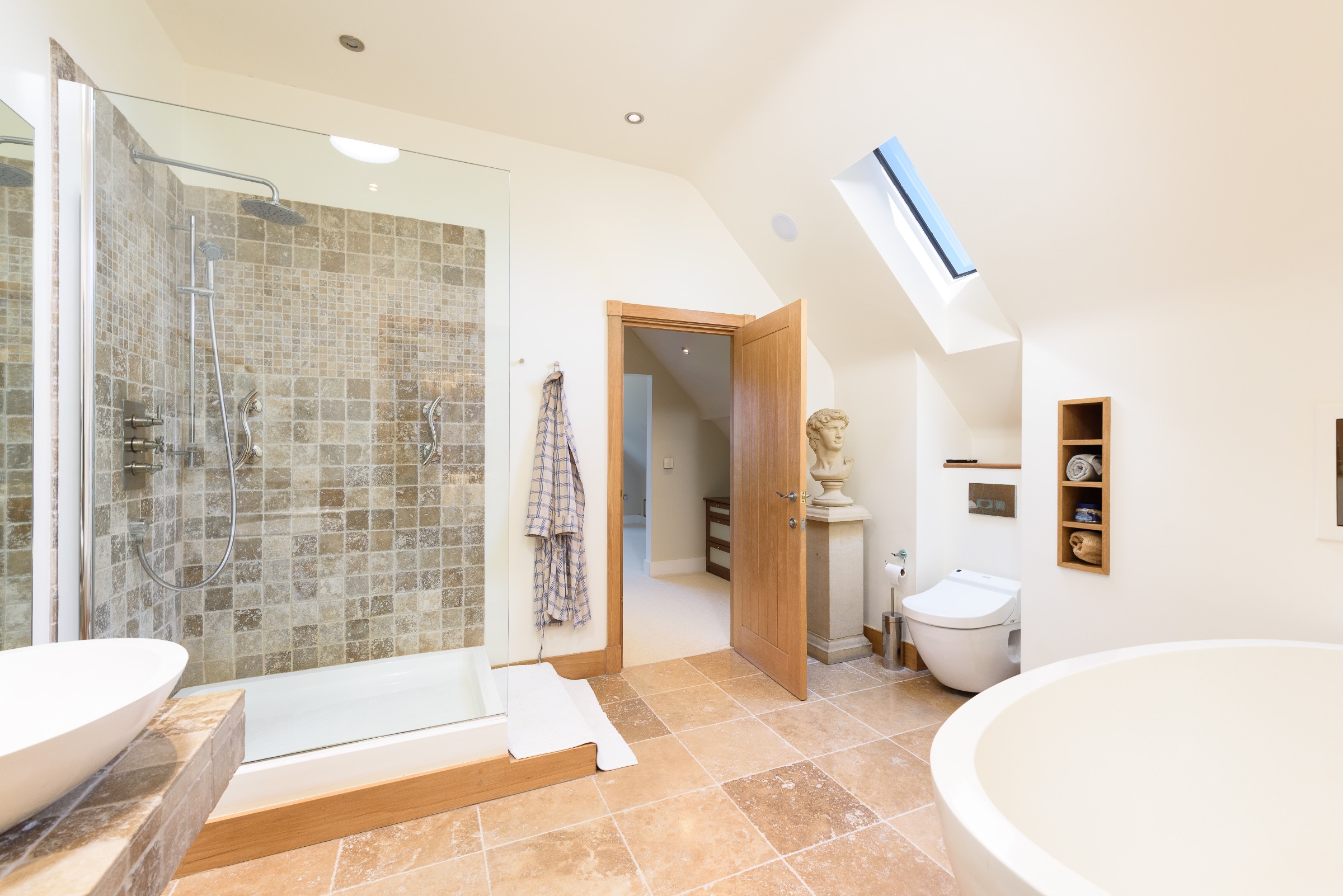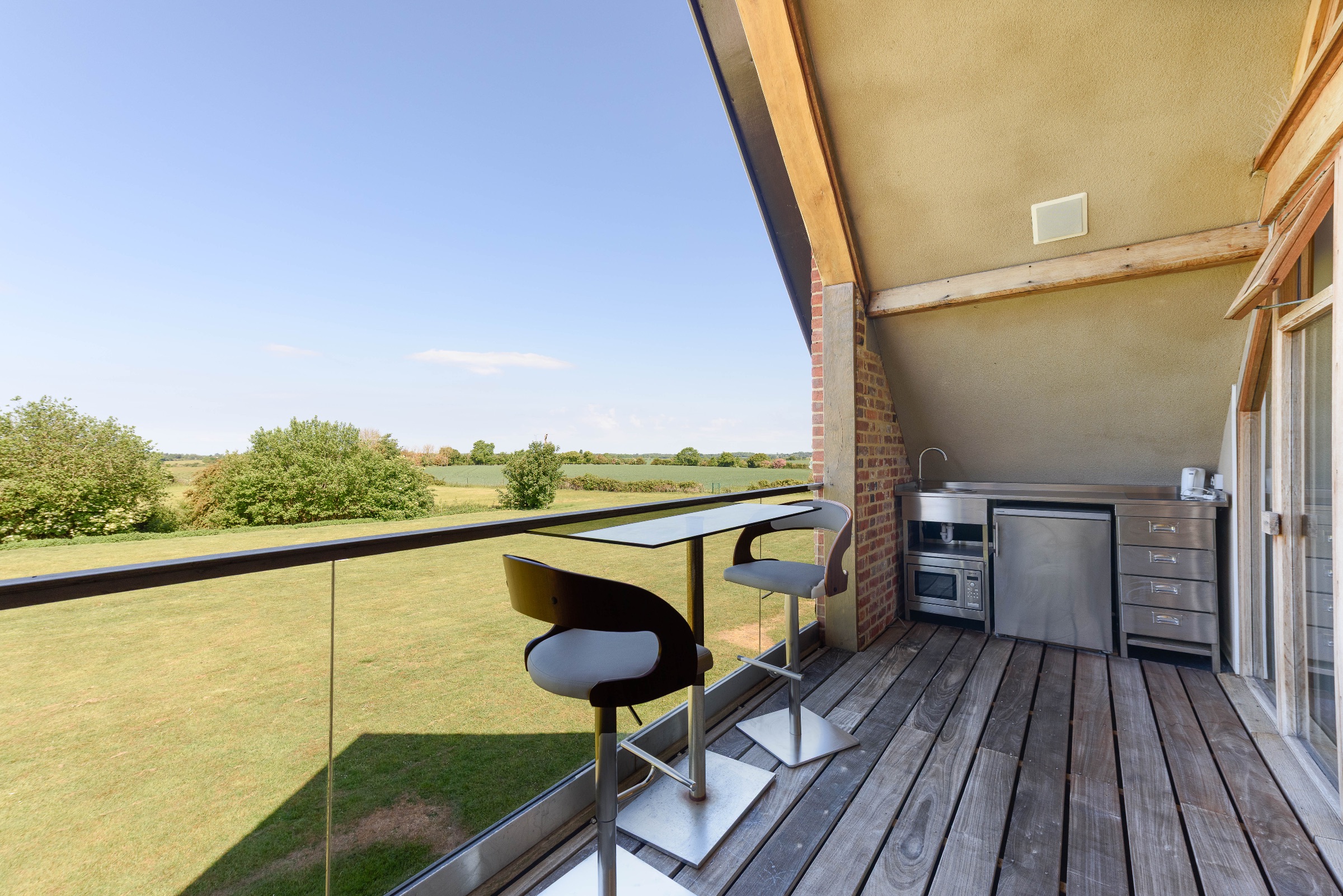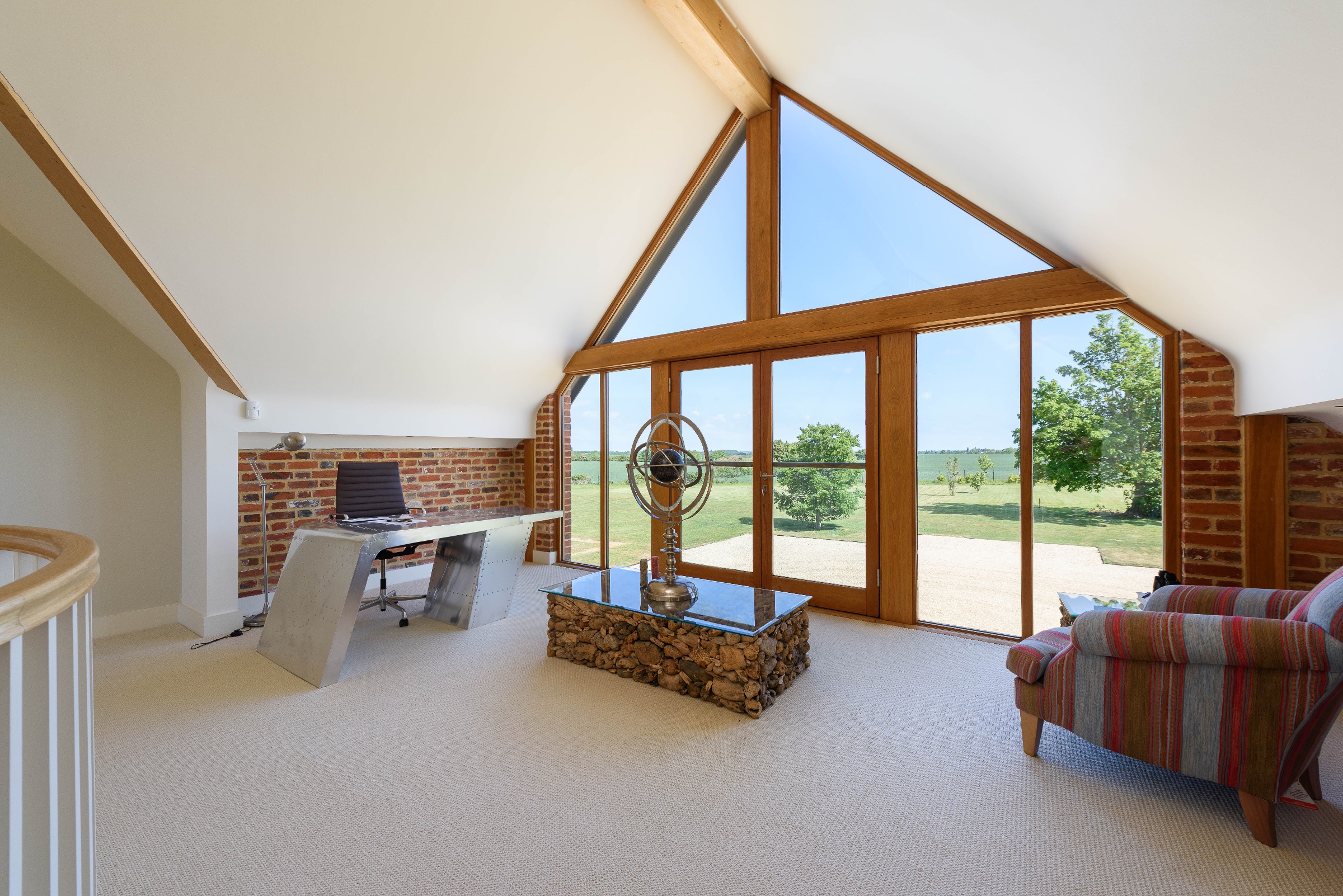 Continuing up to the sumptuous first floor the home now provides five luxurious bedroom suites with a wealth of bespoke built-in wardrobe solutions, branching off from the hallways via the main atrium, with its far-reaching framed views and lofty vaulted ceiling. The principal suite has double doors opening to its own private balcony, a fitted dressing room and a modern en suite bathroom. The house also features a guest suite with its own dressing room and French doors and three further bedrooms all serviced by contemporary en suite facilities.