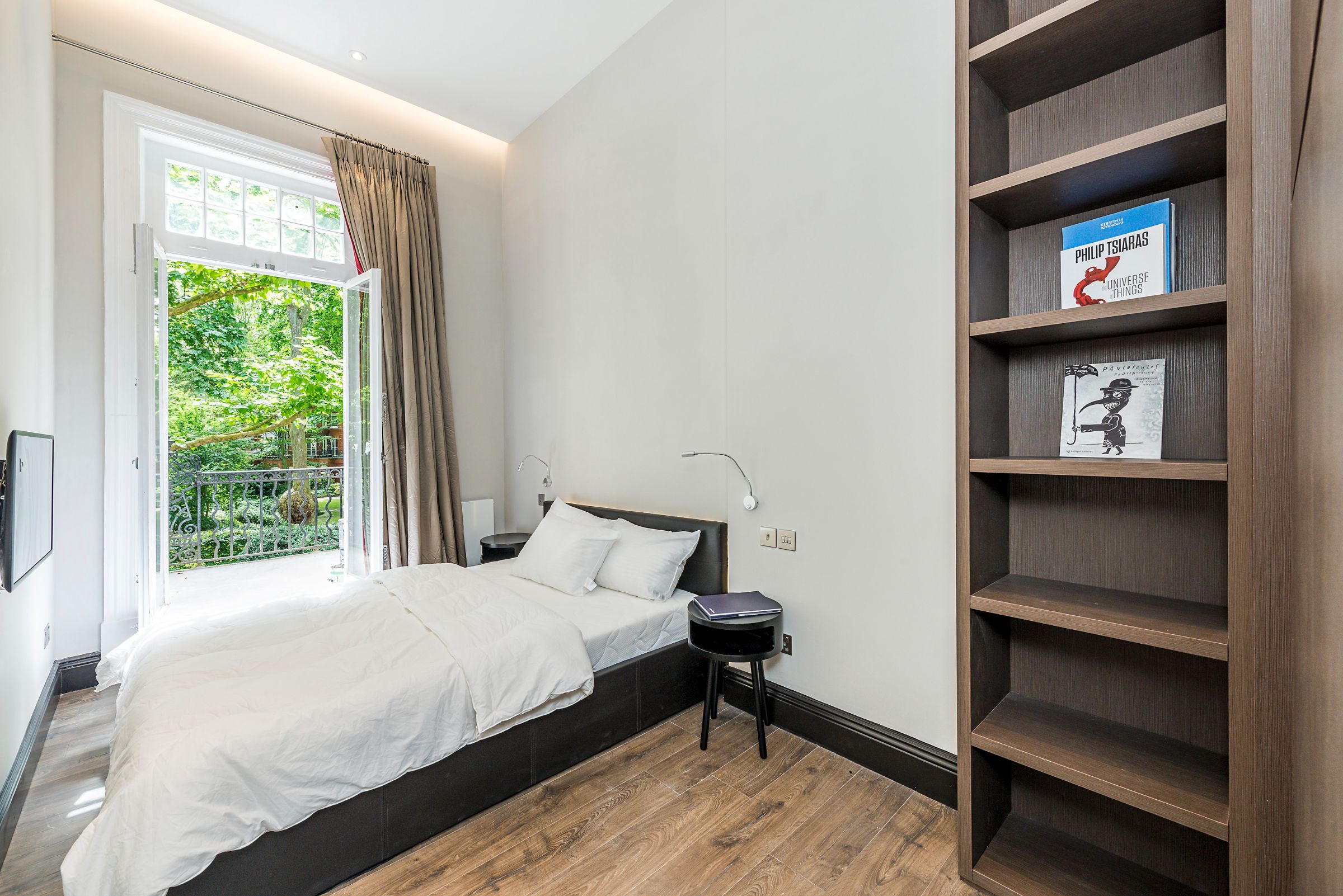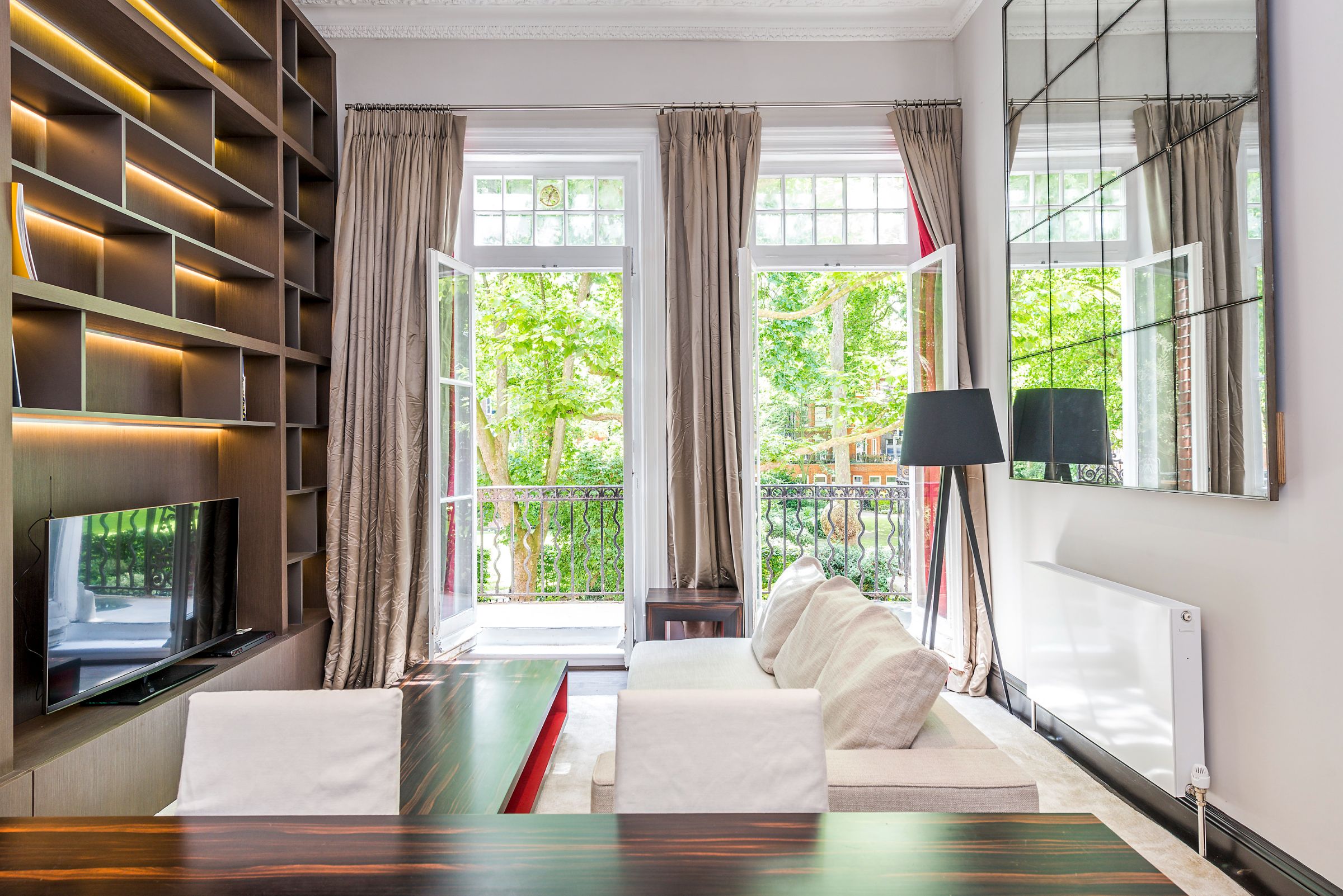 Offered on a short-let basis, this exceptional first-floor apartment boasts a private terrace with stunning south-facing views over the communal gardens.