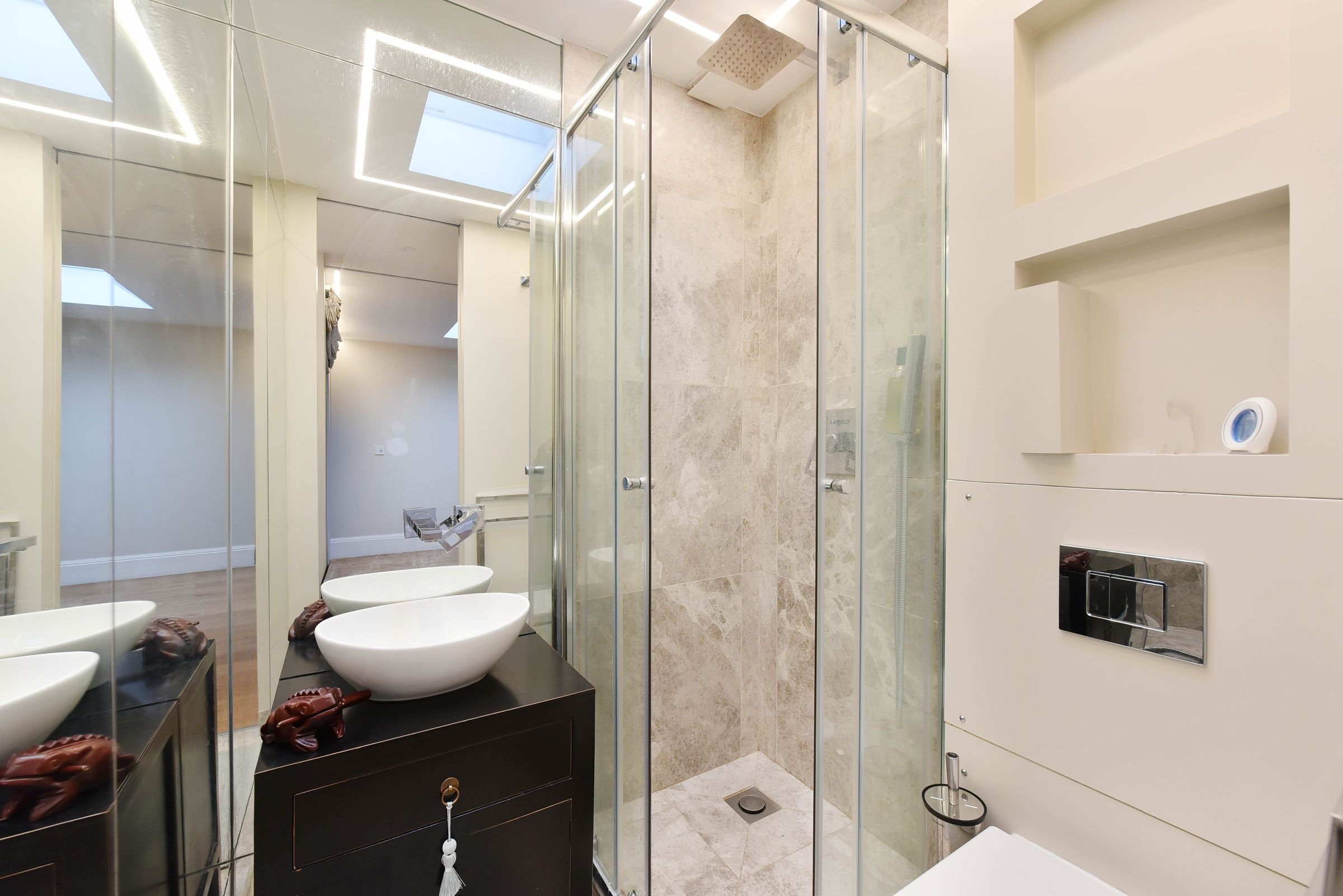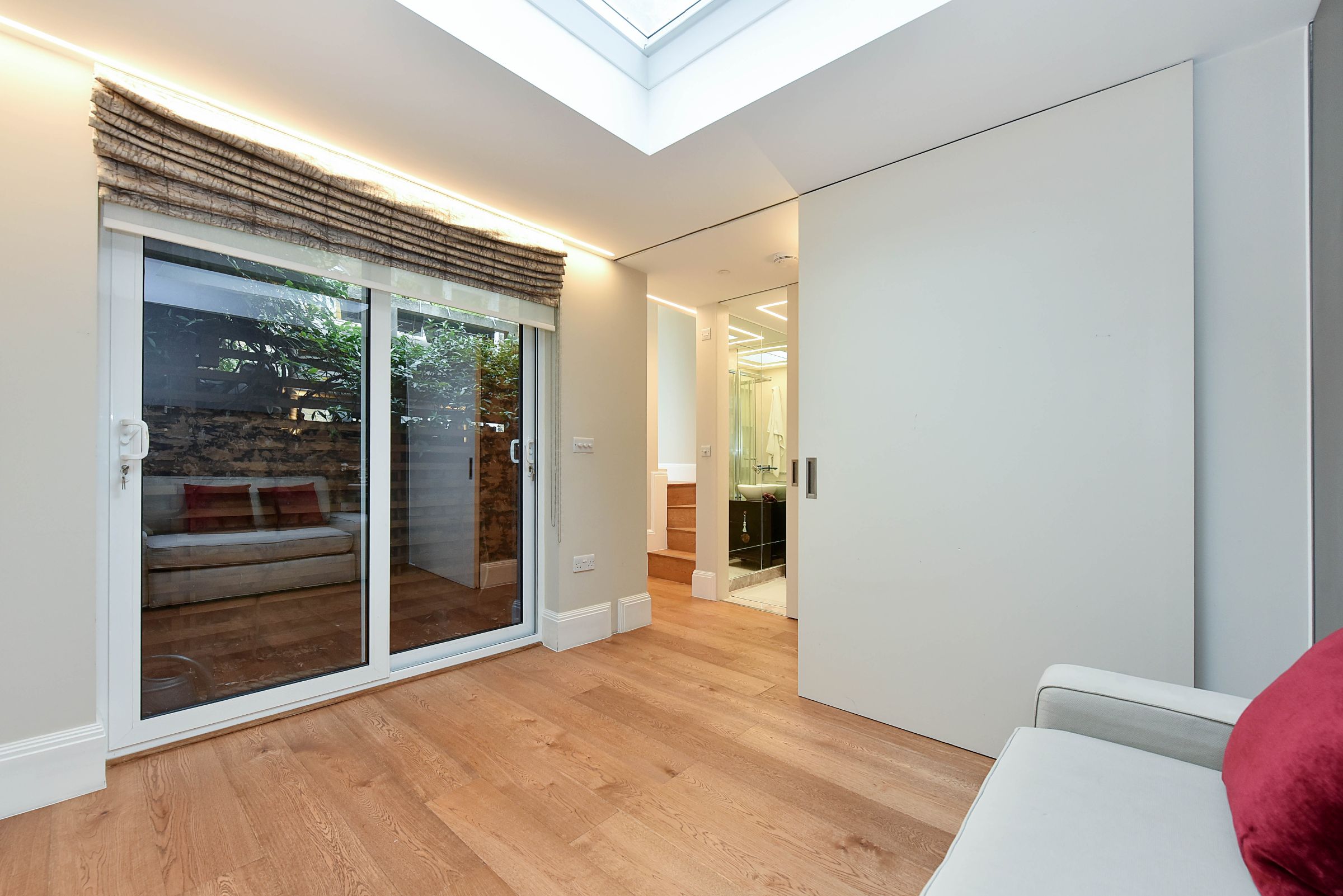 The property features three spacious double bedrooms, all peacefully overlooking the quiet back garden, and three elegant marble bathrooms, ideal for families or professional sharers seeking both comfort and privacy.