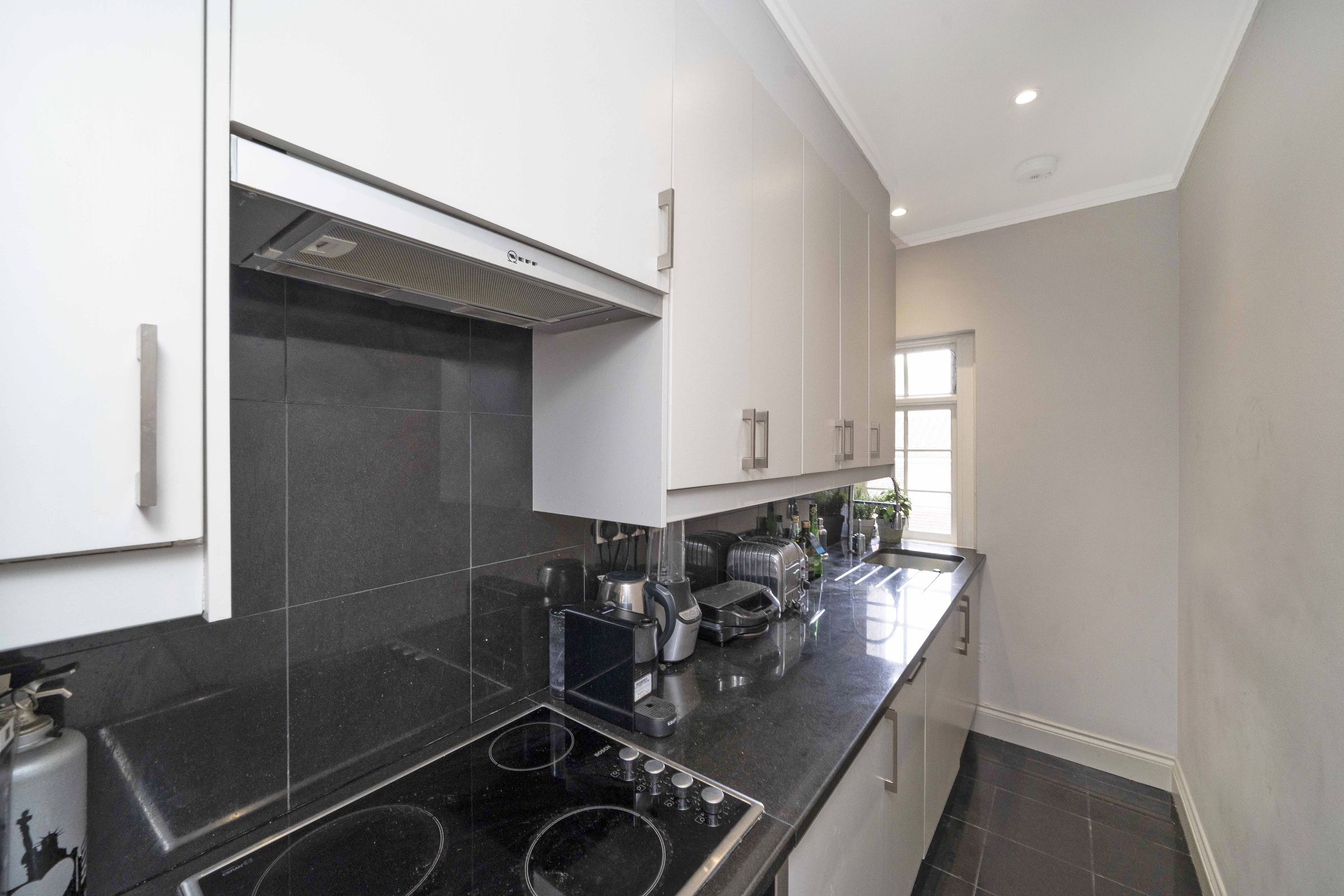The generously proportioned reception room features a south-facing bay window, flooding the space with natural light throughout the day and creating a bright, welcoming atmosphere. A separate, well-designed kitchen is fitted with integrated appliances, offering both practicality and a clean, contemporary finish.