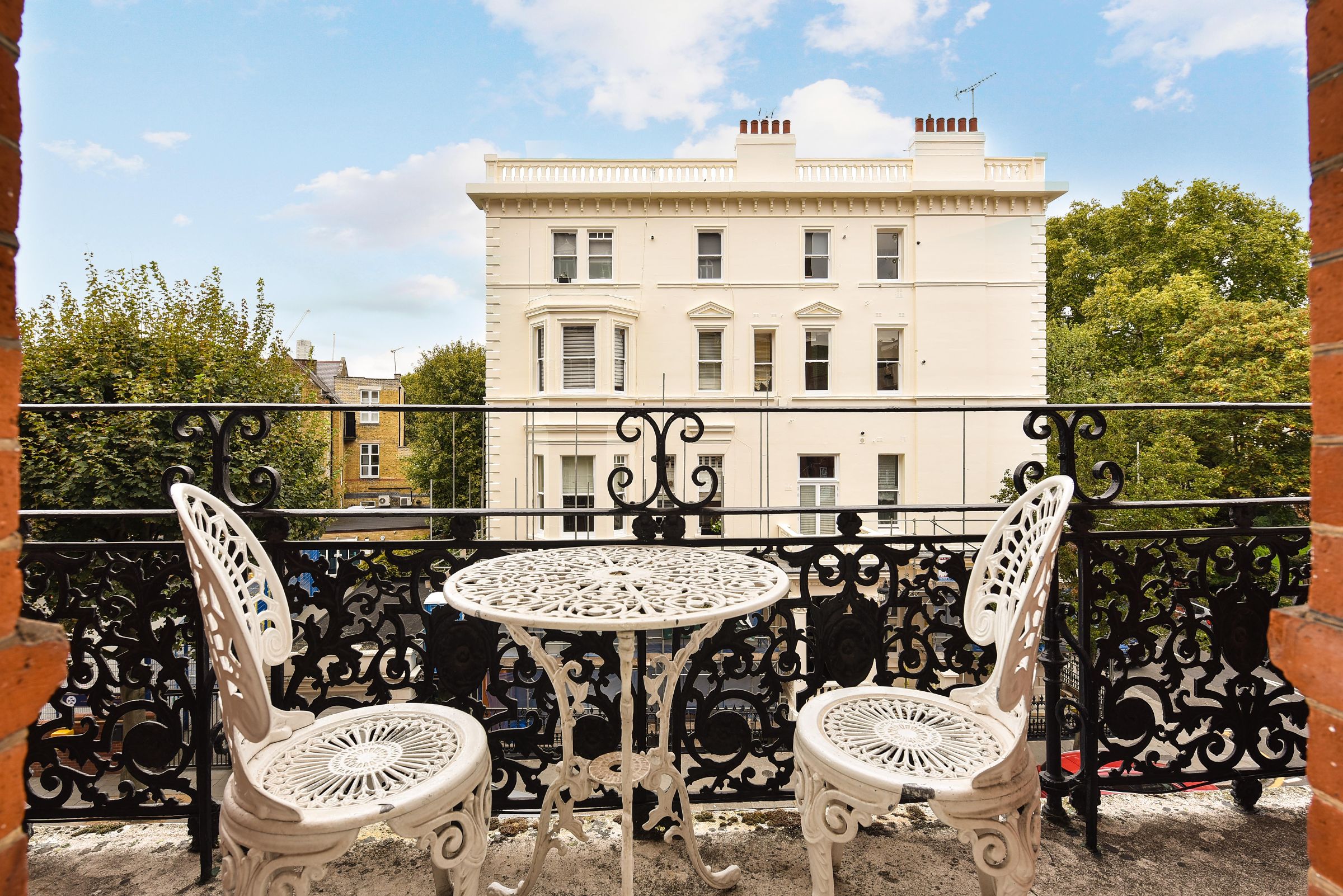 The apartment comprises two generous double bedrooms, with the principal bedroom featuring built-in storage and French windows opening onto the balcony. A bright and spacious reception room is enhanced by large sash windows, which flood the interiors with natural light, while period charm is retained throughout.
