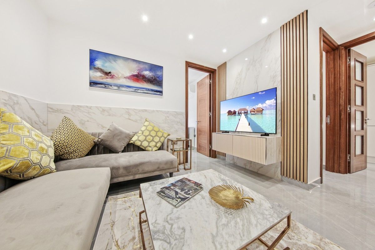 The apartment features a spacious lounge with contemporary furnishings and a sleek modern kitchen equipped with integrated appliances, all finished with high-quality porcelain tiled flooring that adds both style and practicality. Both bedrooms are generously sized and thoughtfully designed, offering ample storage and a calm, comfortable atmosphere. The modern bathroom is fitted with elegant fixtures, including a walk-in shower and WC, providing a touch of luxury.