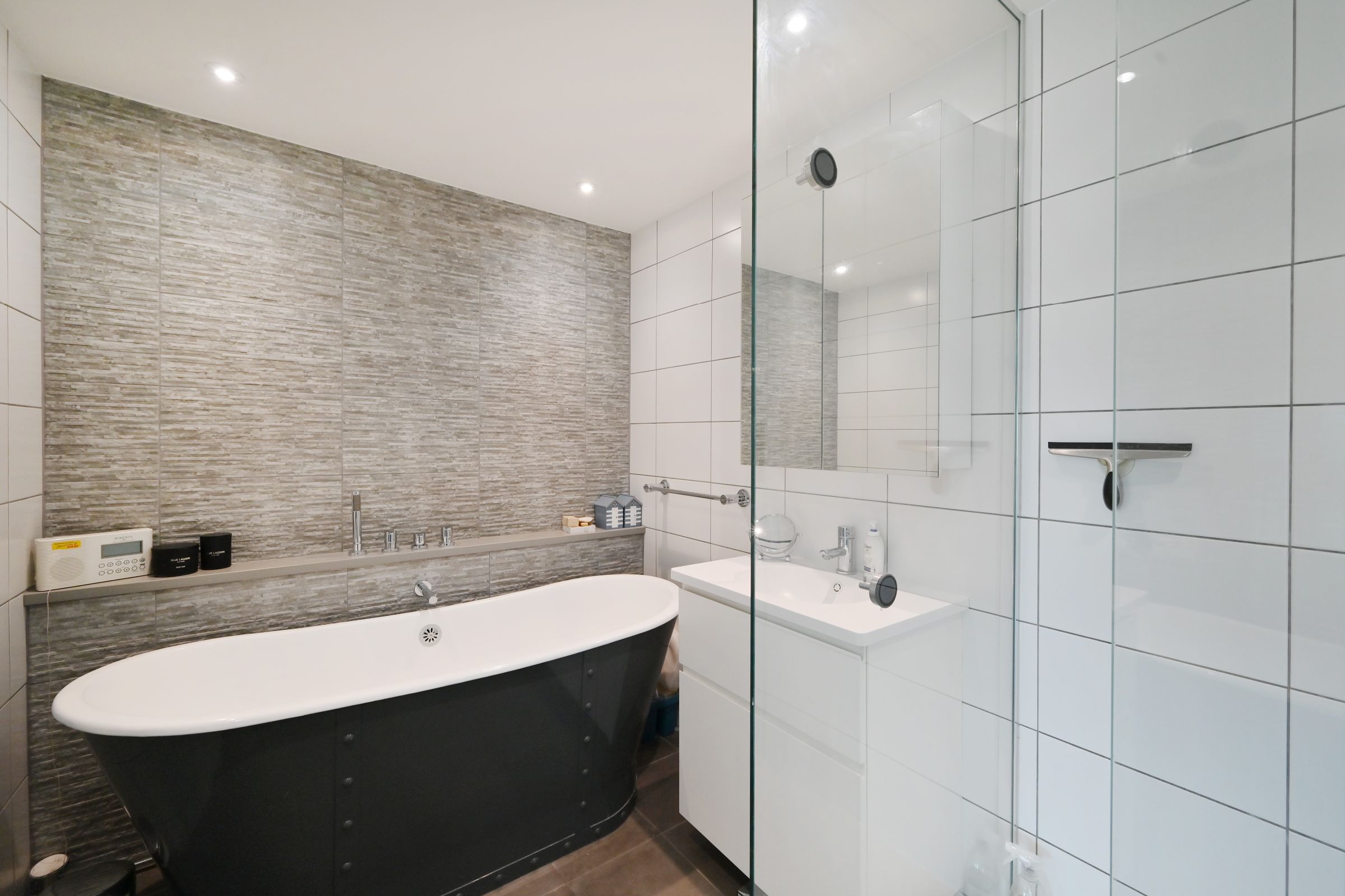 There are two generous double bedrooms, with the principal suite featuring a luxurious en-suite bathroom complete with a freestanding bath. Storage has been cleverly integrated throughout, with both bedrooms offering built-in wardrobes and additional practical storage solutions across the apartment.