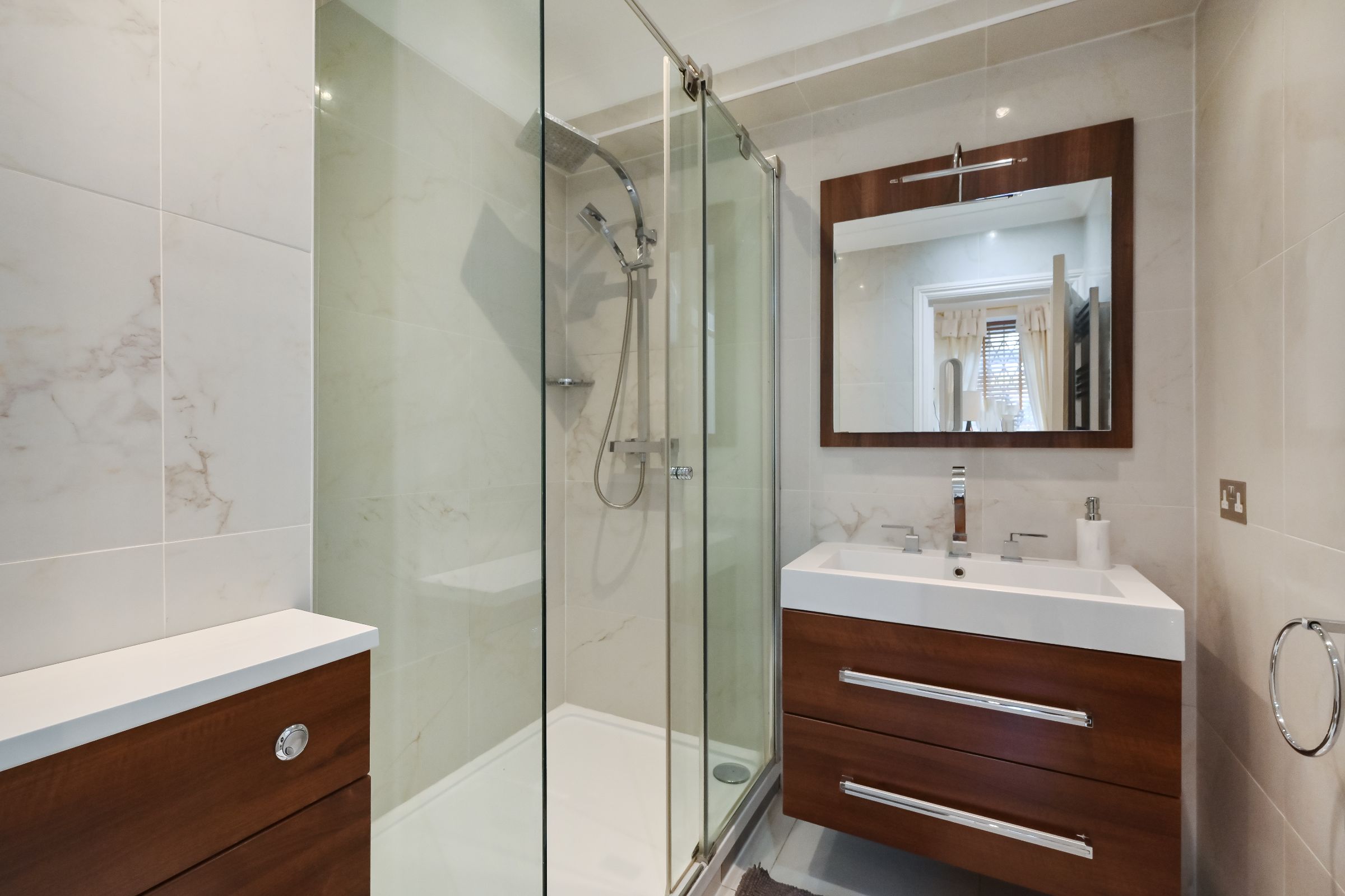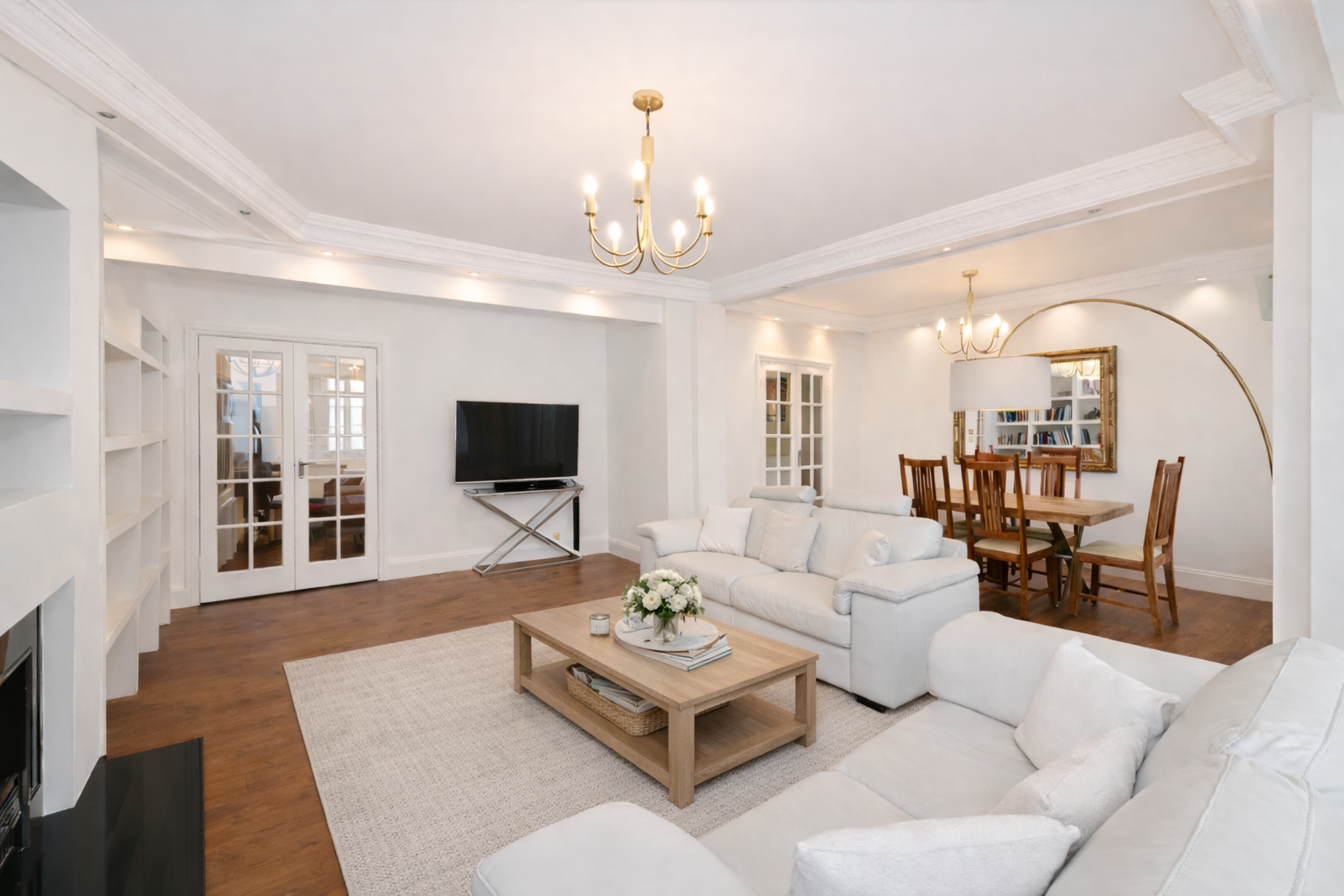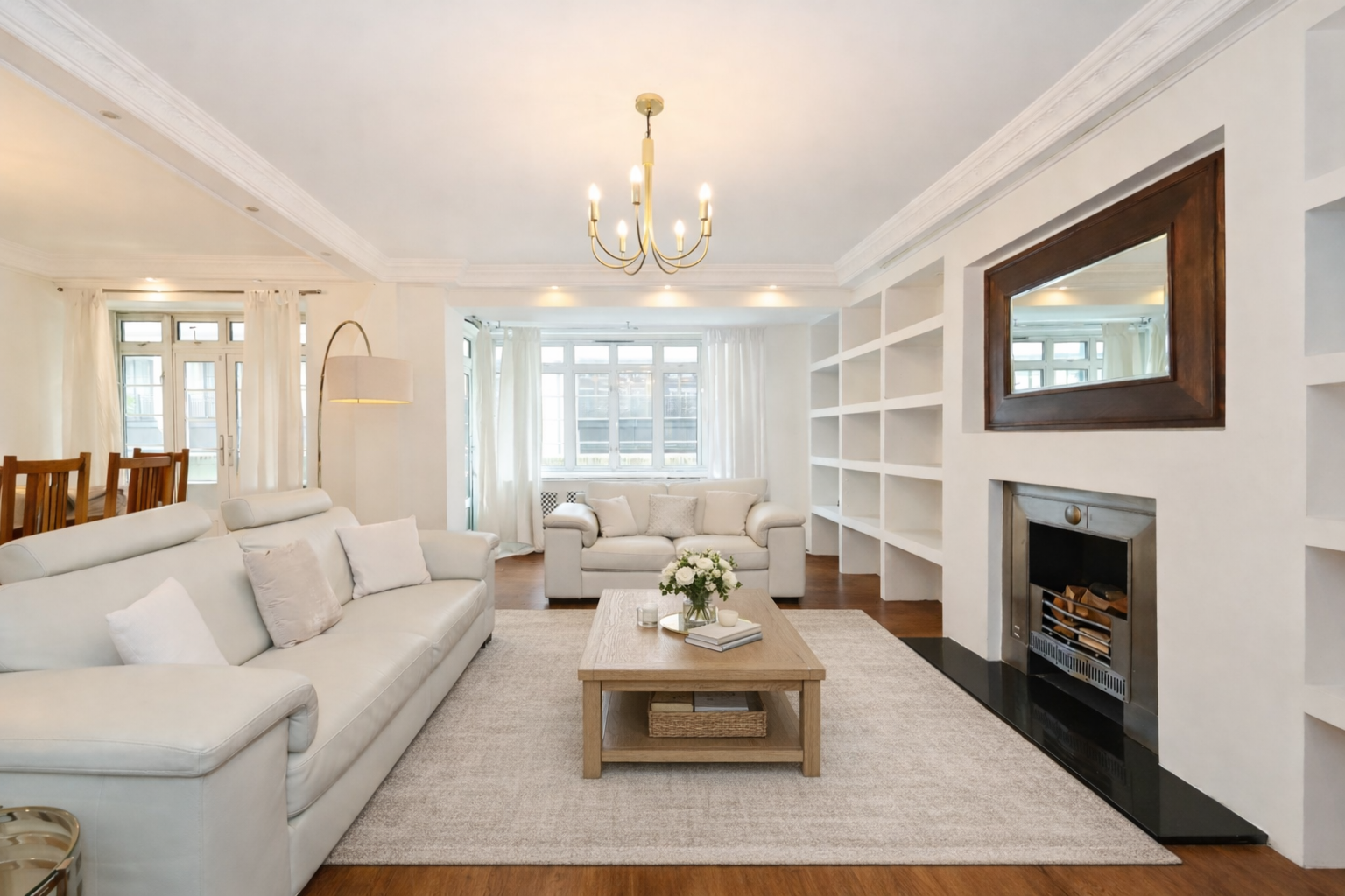 A beautifully presented three-bedroom apartment arranged over 1,800 sq. ft. on the first floor (with lift) of a well-maintained portered building, directly opposite the iconic Whiteley development.