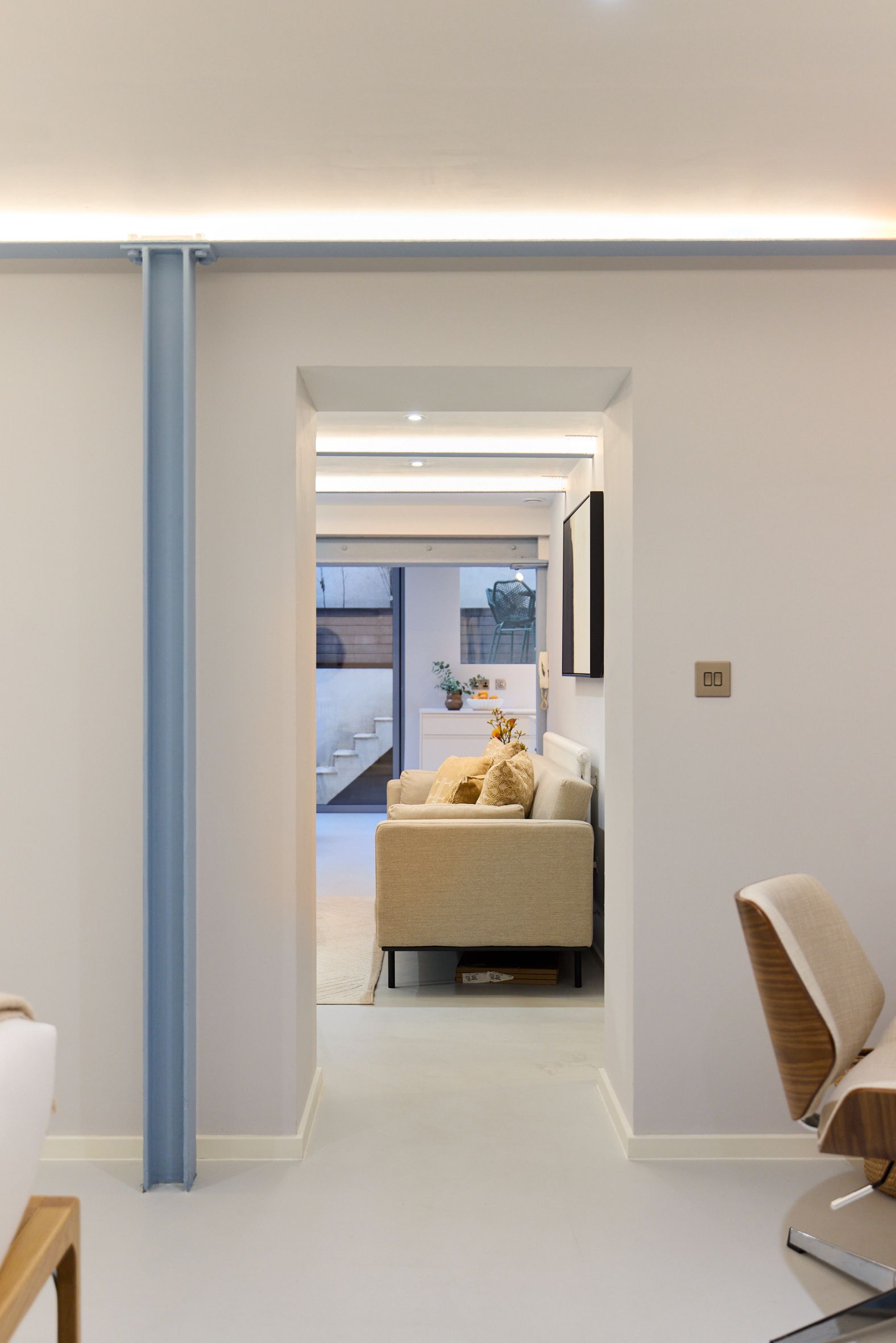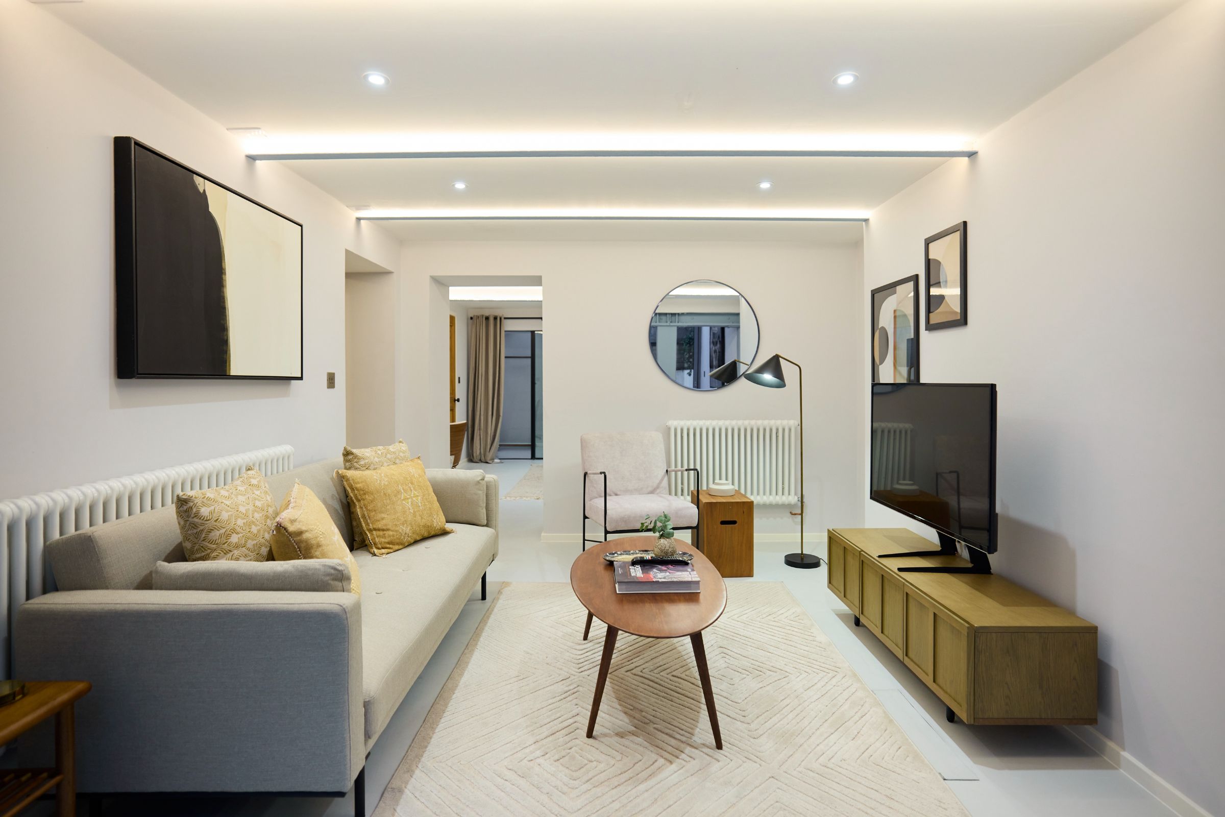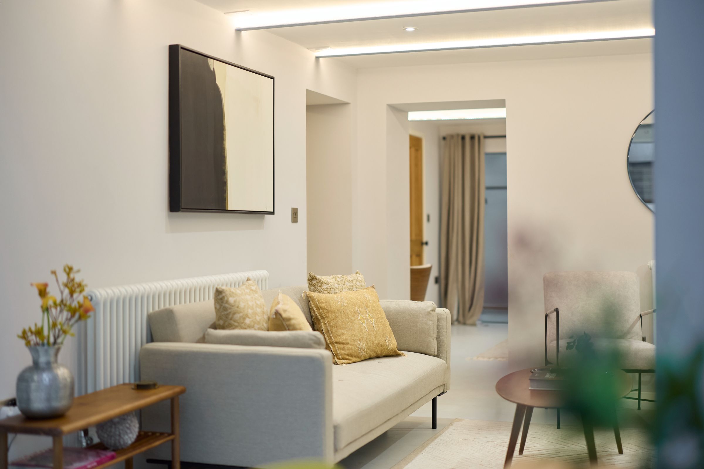 The open-plan reception room is centred around floor-to-ceiling bi-fold doors, creating a seamless connection between indoor and outdoor living. A thoughtfully designed, sleek kitchen with integrated appliances and smart storage enhances the natural flow and sense of openness throughout the space.