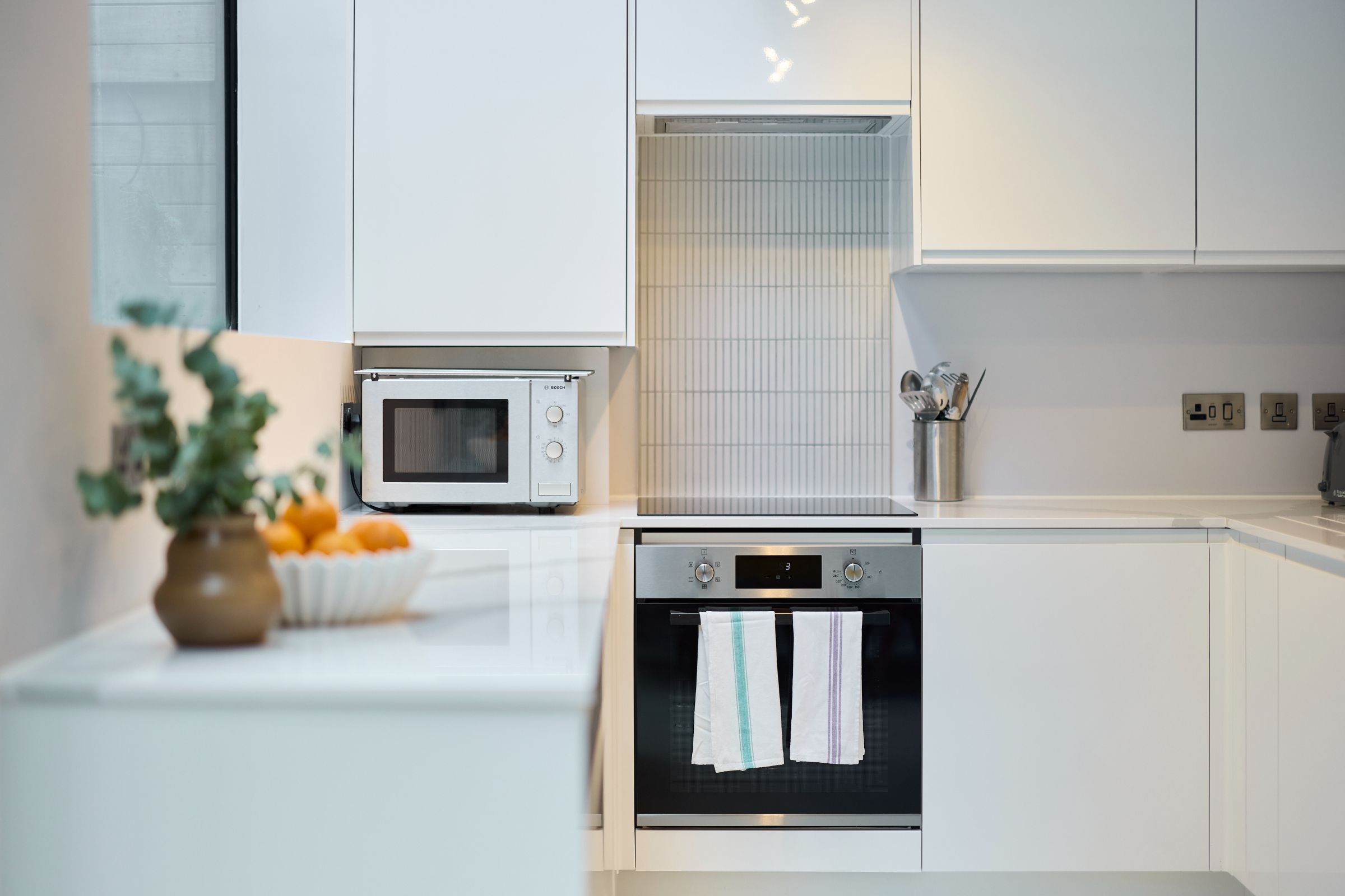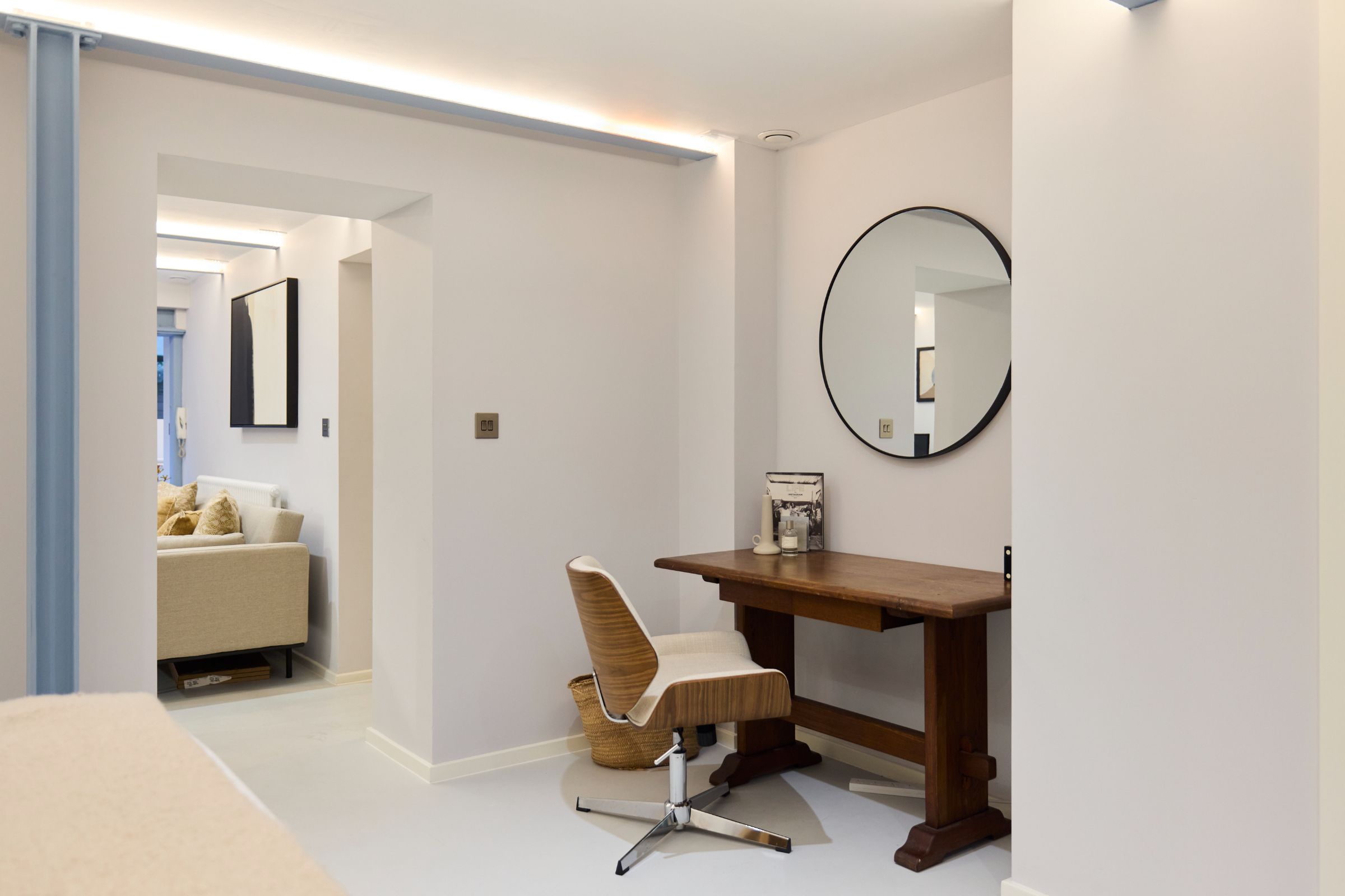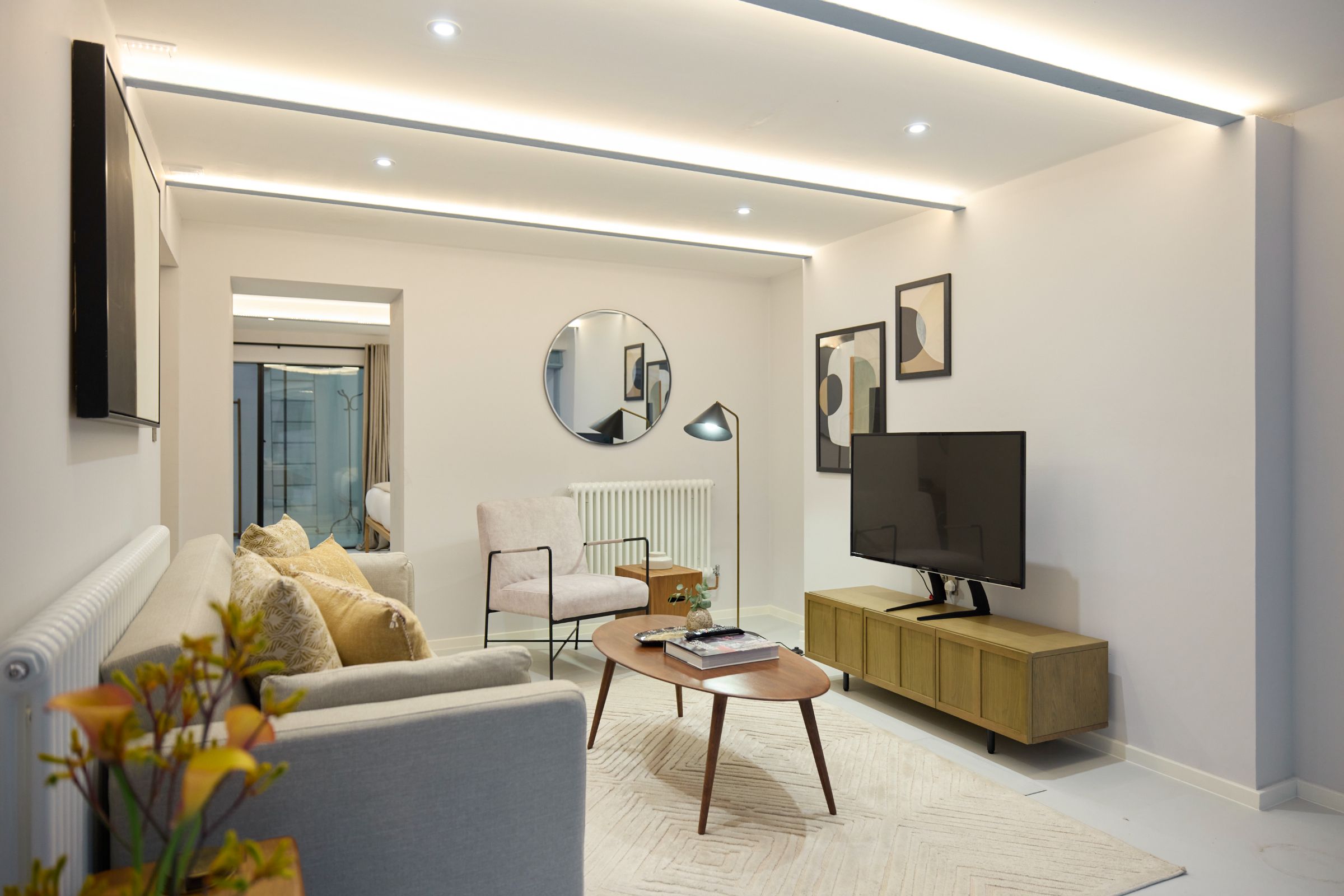 The open-plan reception room is centred around floor-to-ceiling bi-fold doors, creating a seamless connection between indoor and outdoor living. A thoughtfully designed, sleek kitchen with integrated appliances and smart storage enhances the natural flow and sense of openness throughout the space.