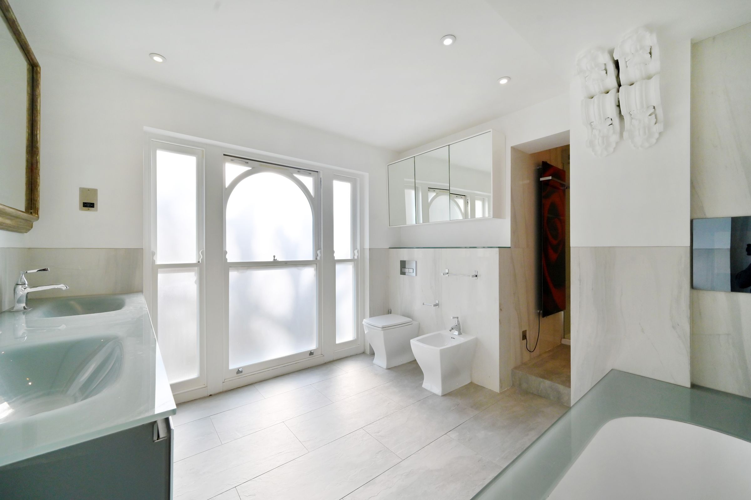 This elegant home perfectly balances contemporary living with classic period features. High ceilings and wooden floors throughout enhance the sense of space and refinement, while the open-plan living area provides an ideal setting for entertaining. Large windows flood the space with natural light, creating a warm and inviting atmosphere. Both bedrooms feature their own en-suite bathrooms, with the principal suite further benefiting from a bathtub and direct access to the private terrace.