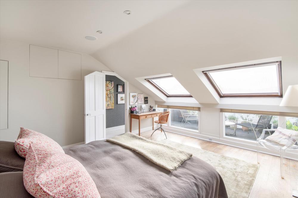 The top floor of the property is taken up by the luxurious master bedroom suite. This room features both a substantial ensuite bathroom with a large bath tub, a separate walk-in shower and also a large walk-in closet. Two large skylights in this room create a bright and airy space with views of the gardens and the night sky. From the master bedroom you also have access onto a top floor terrace which is a lovely place to have an evening drink or simply admire the views of the garden.