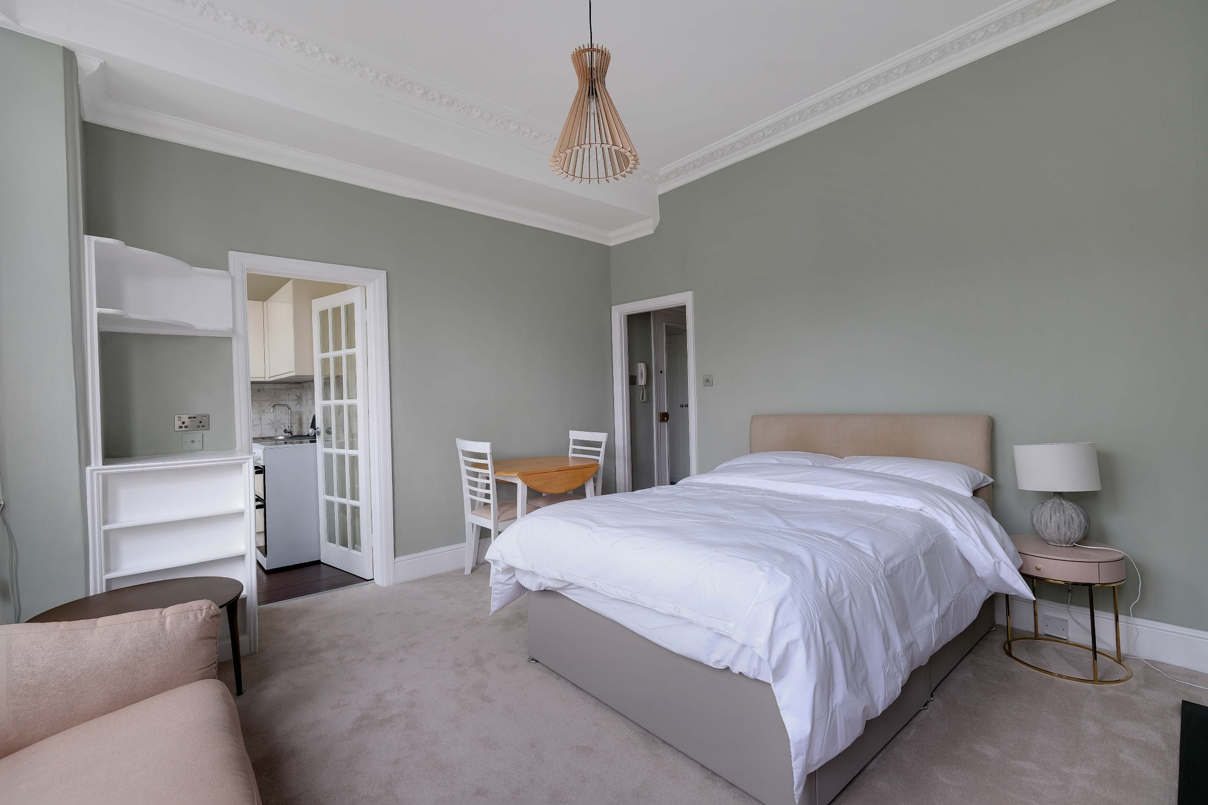 A bright, recently refurbished studio apartment set over the first floor of this striking white stucco fronted building located on one of the most desirable street in Kensington.