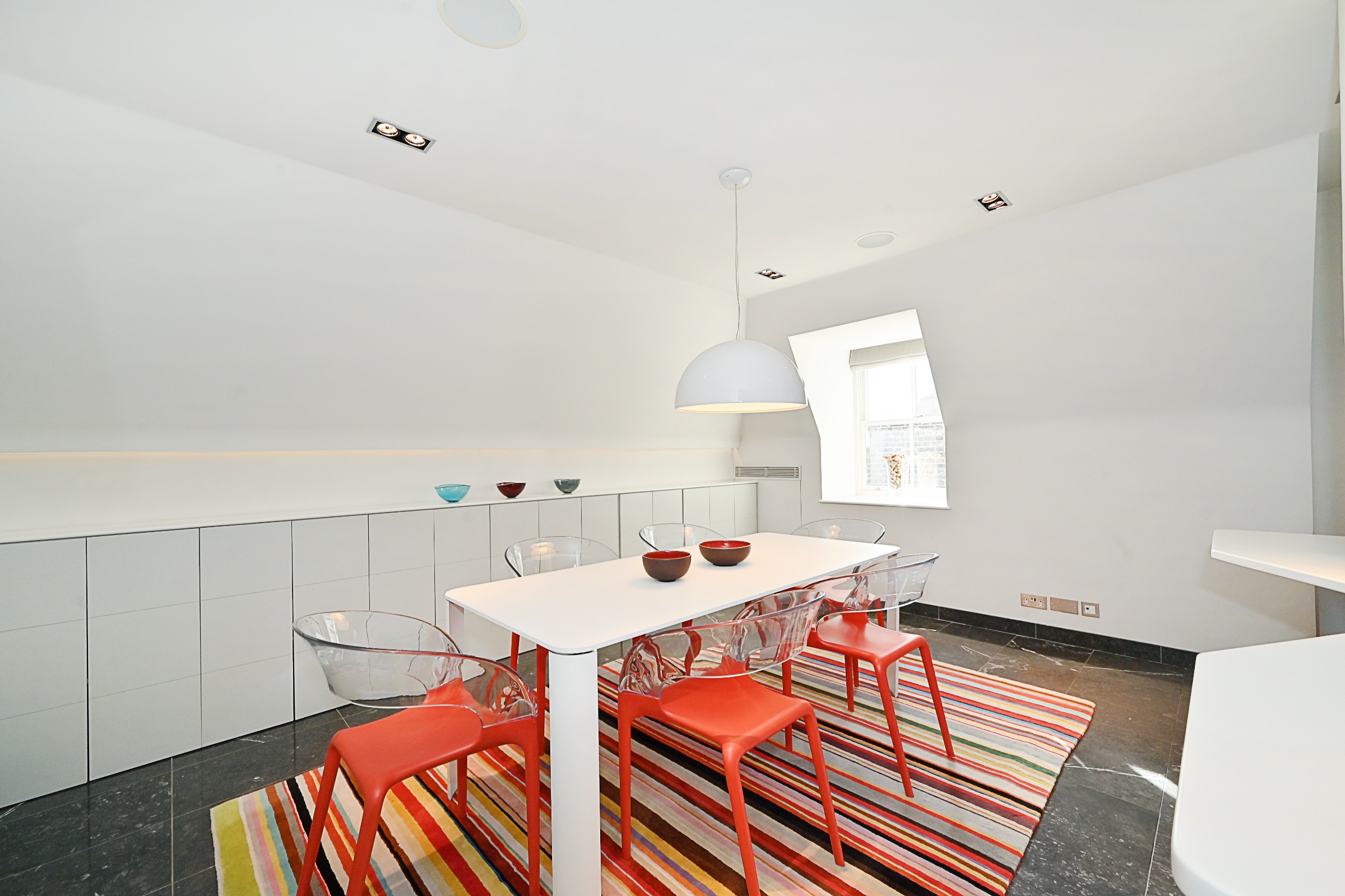 Accessed directly via the lift the property is split over two floors and perfectly laid out for grand entertaining but also cosy and discreet for hiding away in the very heart of Kensington. To the front of the property enjoying the stunning views is the large open reception room with ample space for dinning. Also on this floor is a spacious open plan kitchen with large dinning table perfect for those quiet family dinners.