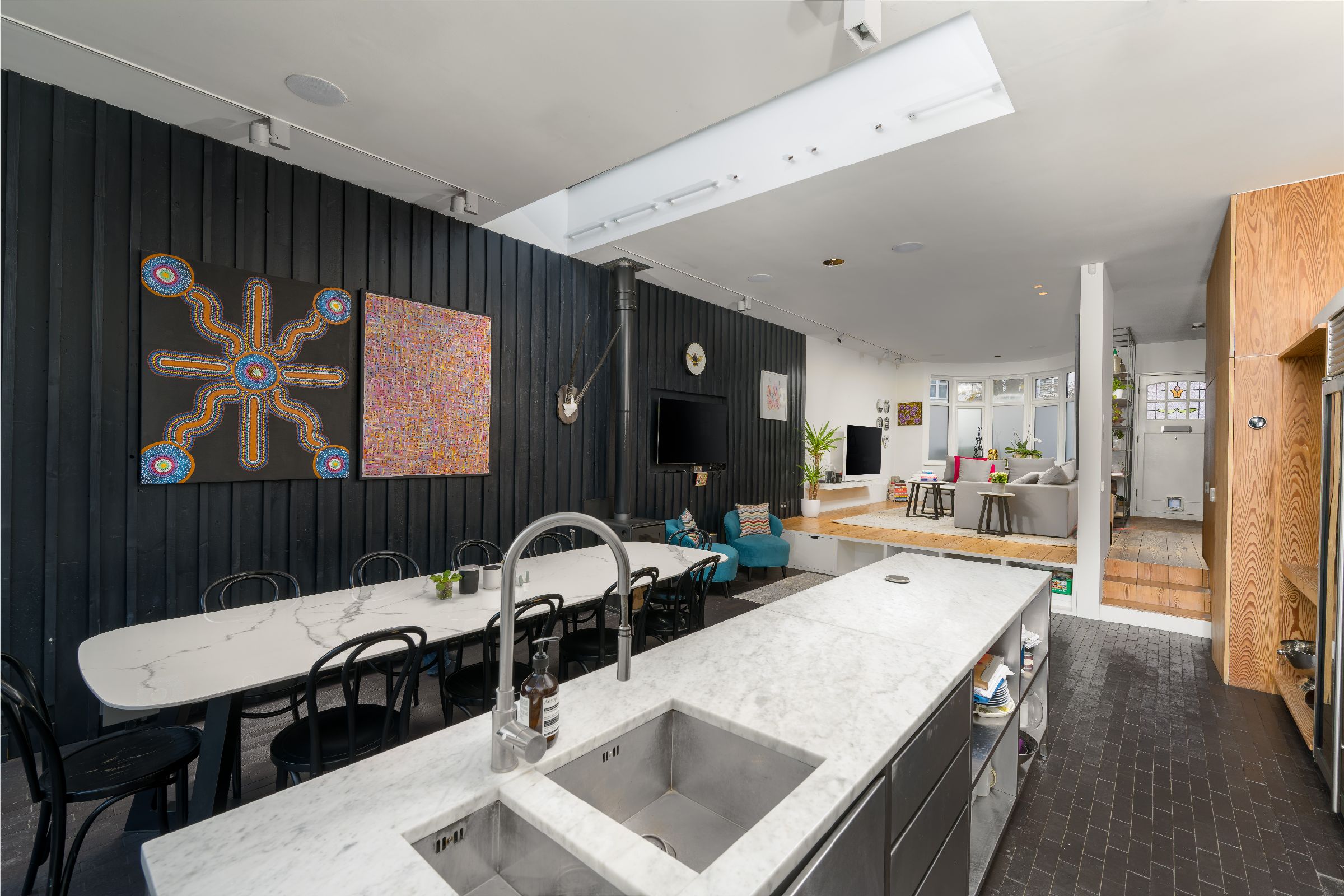 Walking through the front door, you're greeted by the open plan ground floor. Looking through, you can see the south-facing, serene garden, smart swimming pool, grass-topped sauna. The ground floor is bright, contemporary and perfect for family living. You'll immediately notice the black-painted, wooden feature wall behind the wood-burning stove which is made up of the property's original floorboards. The kitchen is lined with second-hand steel units, wooden shelves and a white marble countertop.