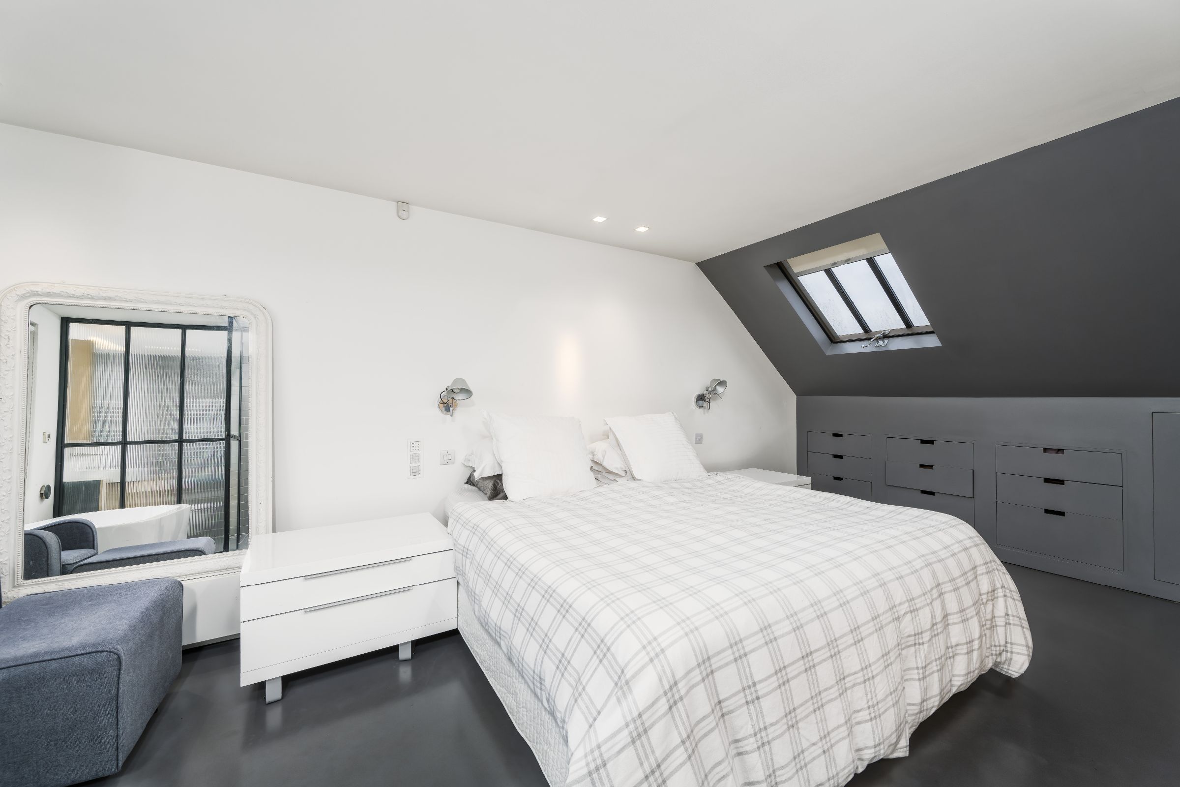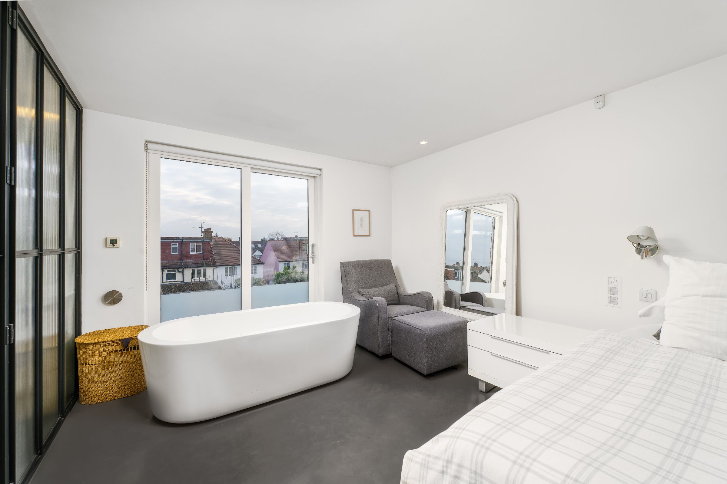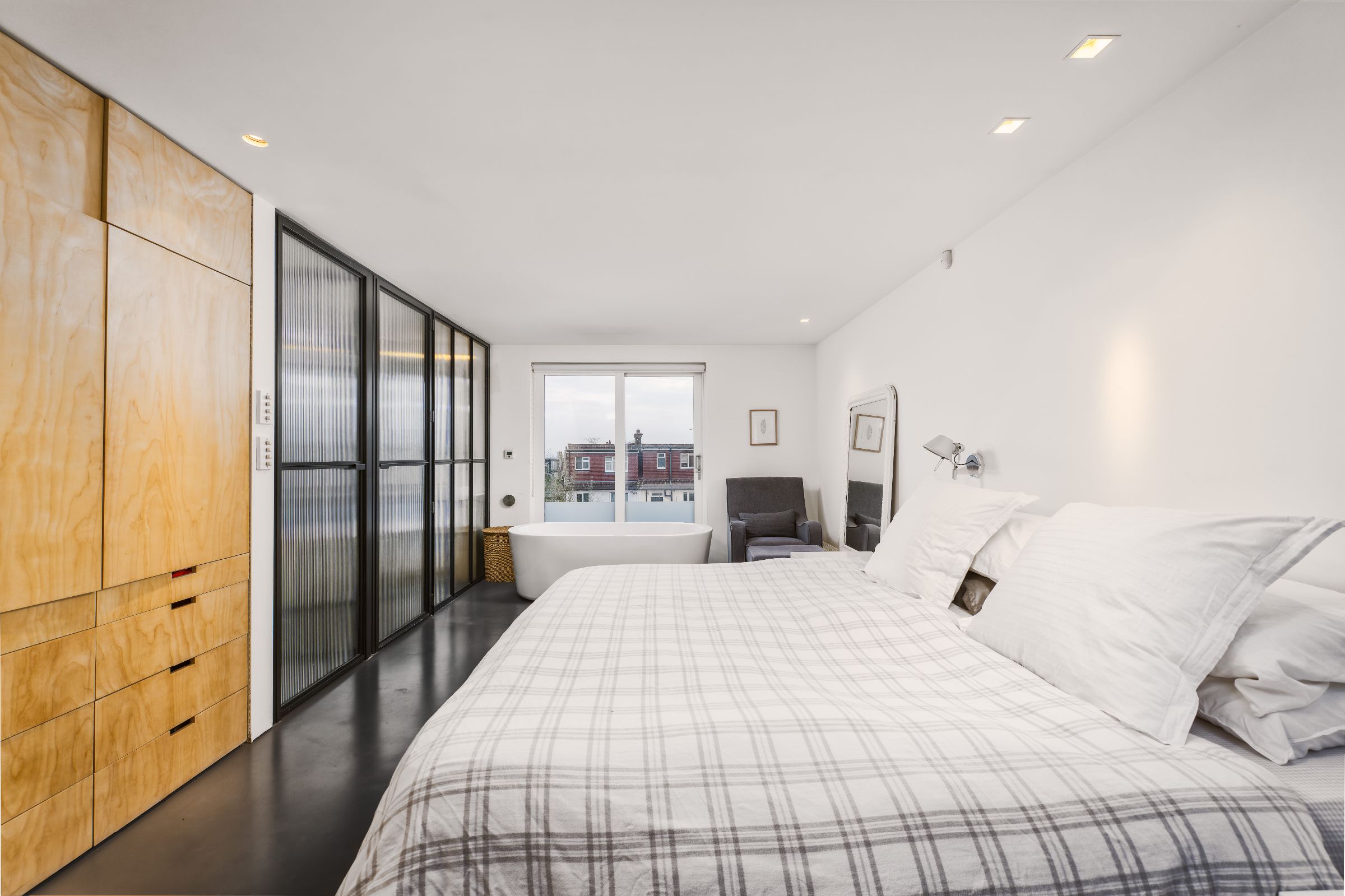 The converted attic is now a bright master suite. With an egg bath under the window, this is the perfect sanctuary at the end of a busy day. Ample storage and an entirely glass-walled en-suite complete the master bedroom.