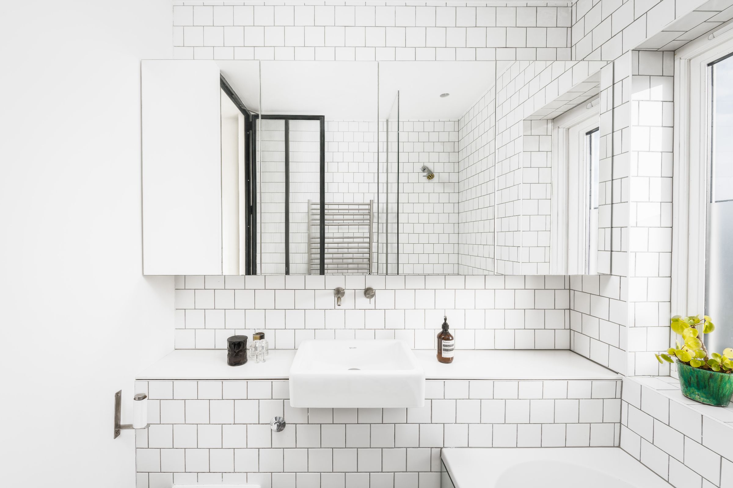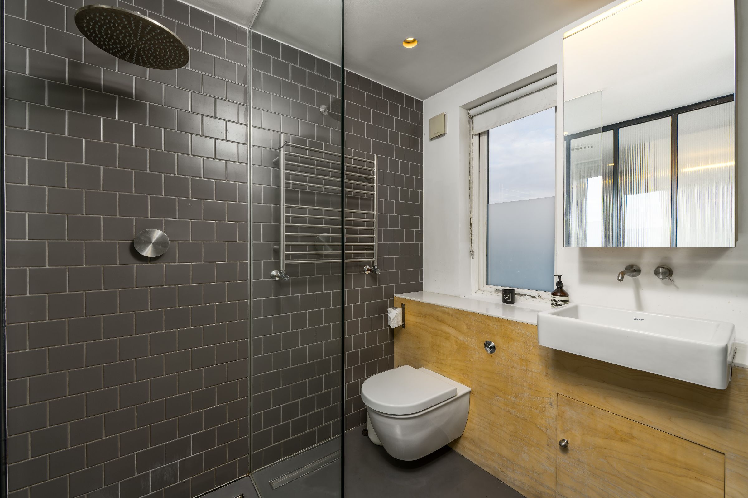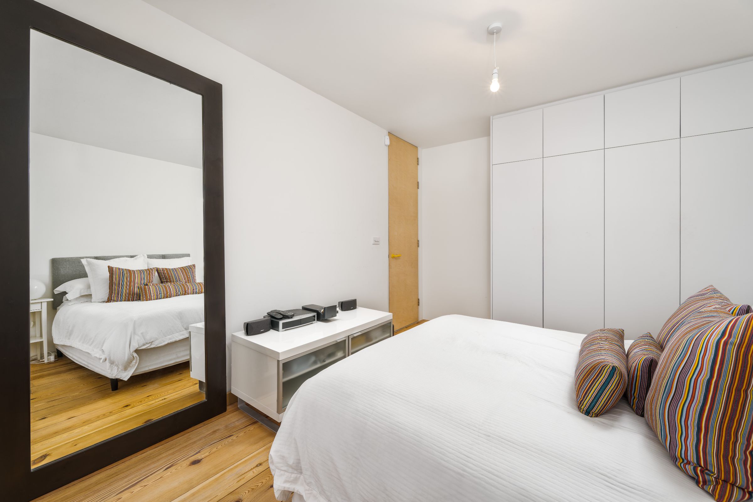 The converted attic is now a bright master suite. With an egg bath under the window, this is the perfect sanctuary at the end of a busy day. Ample storage and an entirely glass-walled en-suite complete the master bedroom.