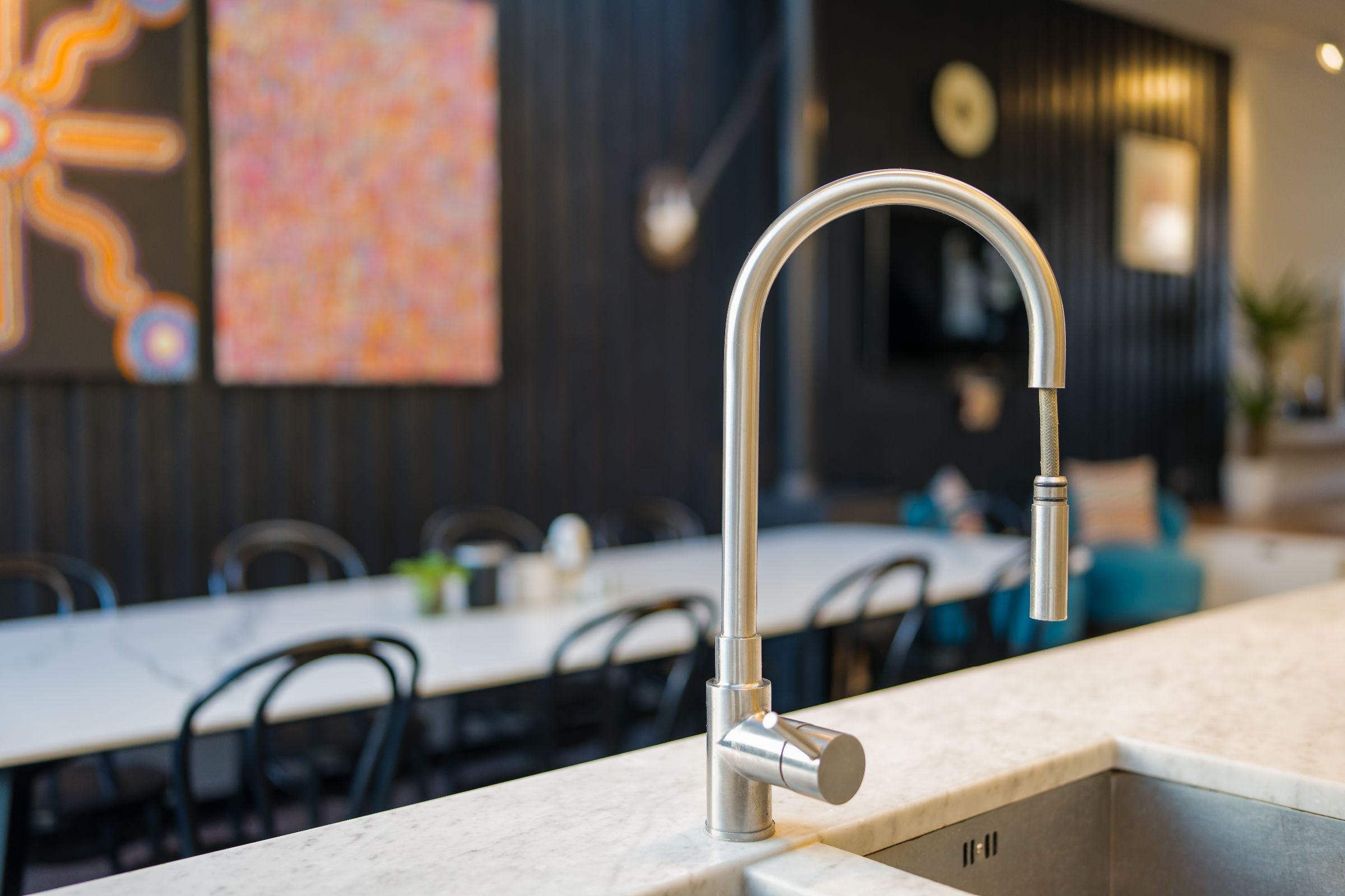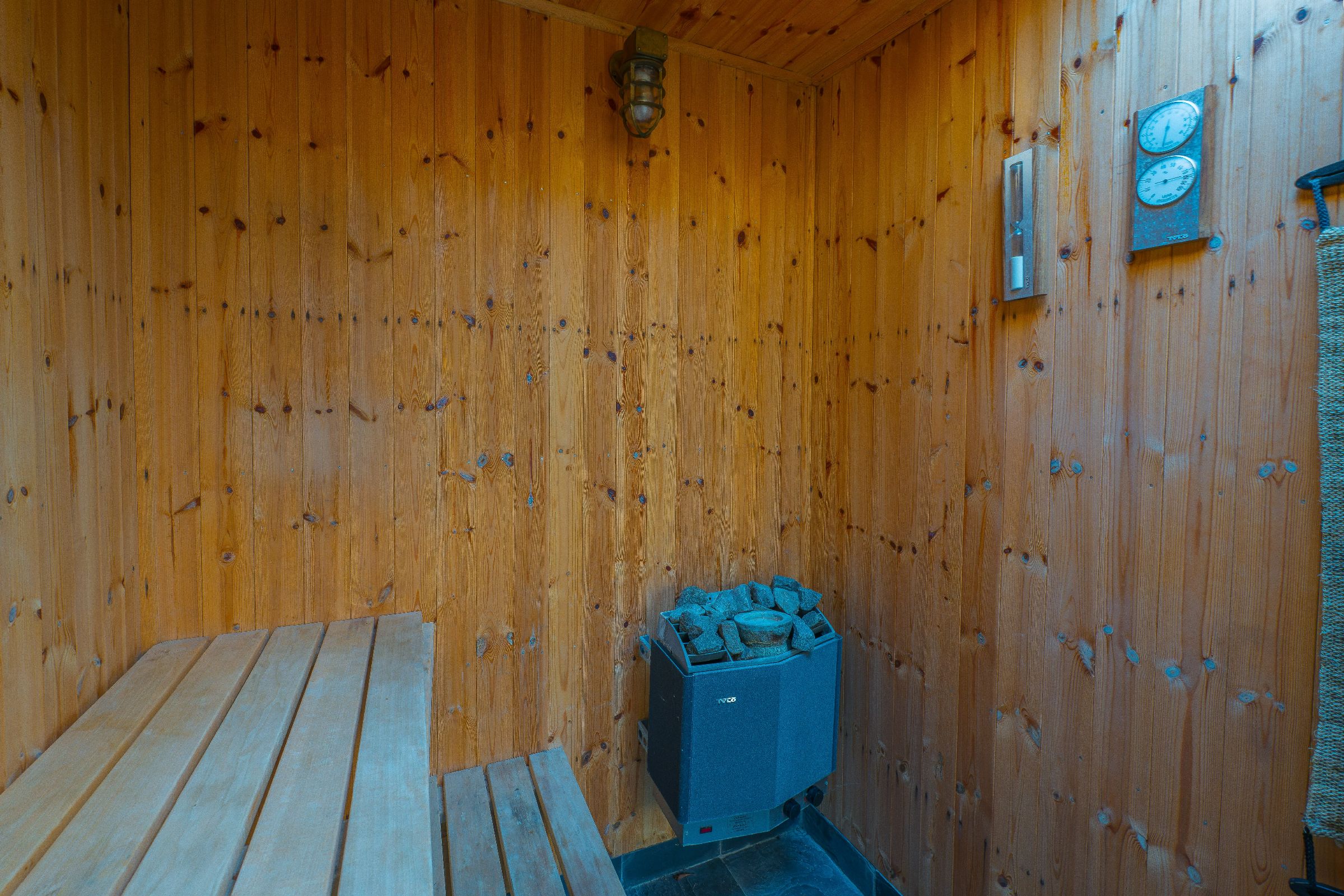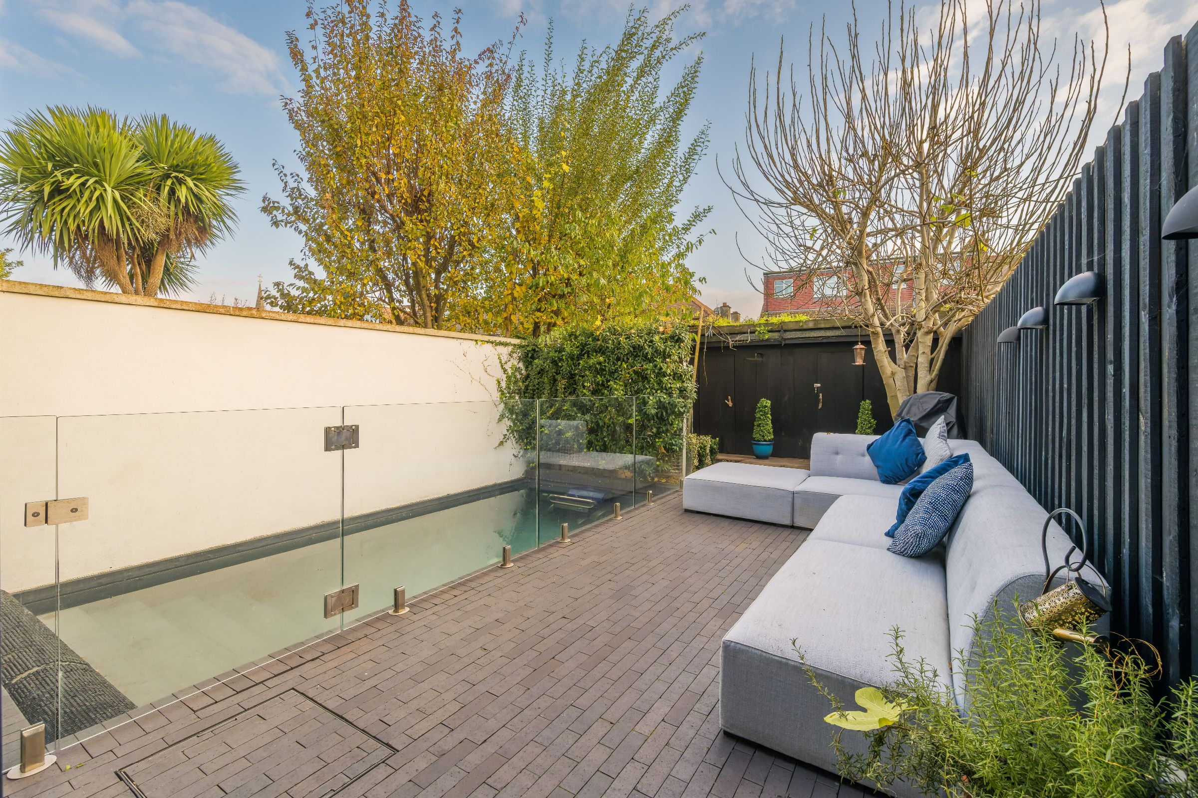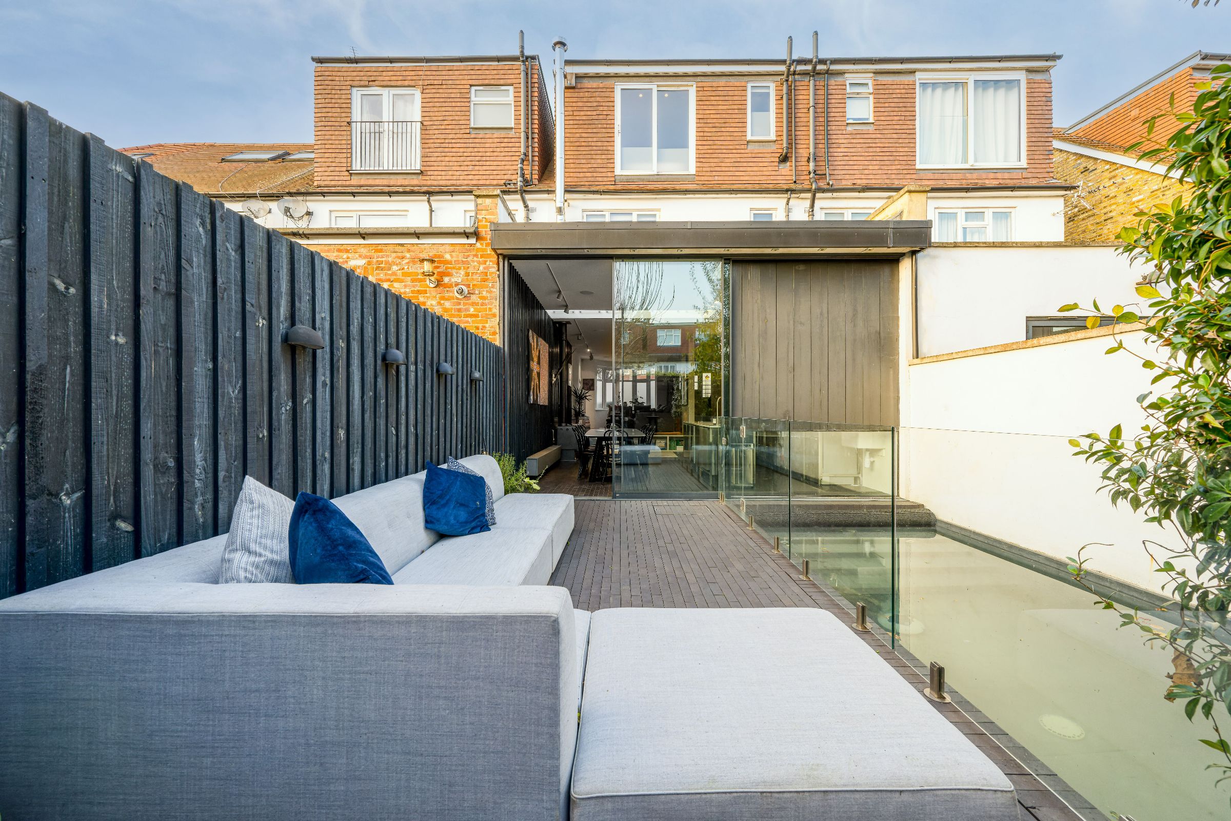 Walking through the front door, you're greeted by the open plan ground floor. Looking through, you can see the south-facing, serene garden, smart swimming pool, grass-topped sauna. The ground floor is bright, contemporary and perfect for family living. You'll immediately notice the black-painted, wooden feature wall behind the wood-burning stove which is made up of the property's original floorboards. The kitchen is lined with second-hand steel units, wooden shelves and a white marble countertop.